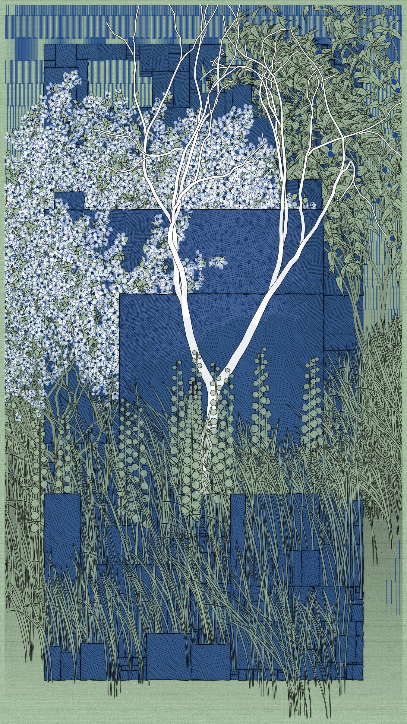 How can one create a work inspired by a city where one has never set foot? Moreover, a place on the other side of the world, whose history and cultural richness are of such dizzying density? I quickly realized that my work could only be imagined, dreamed, imbued with my Western culture, tinged with my distant prejudices. I worked with a visual approach above all, around a few chosen colors, representative tree species, and some clichéd symbols: for example, the composition is organized around 3 abstract shapes, including the circle, directly inspired by the rising sun on the flag, the rectangular shape of a kakemono, or a cityscape.