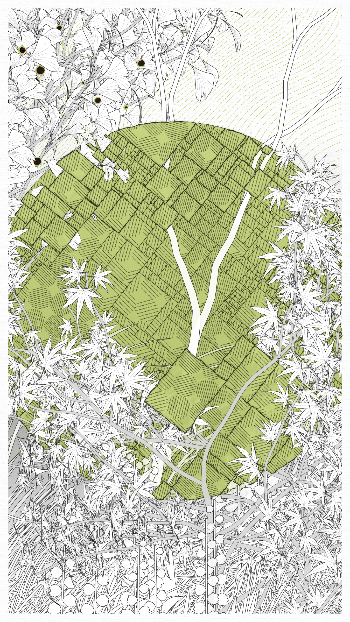 How can one create a work inspired by a city where one has never set foot? Moreover, a place on the other side of the world, whose history and cultural richness are of such dizzying density? I quickly realized that my work could only be imagined, dreamed, imbued with my Western culture, tinged with my distant prejudices. I worked with a visual approach above all, around a few chosen colors, representative tree species, and some clichéd symbols: for example, the composition is organized around 3 abstract shapes, including the circle, directly inspired by the rising sun on the flag, the rectangular shape of a kakemono, or a cityscape.