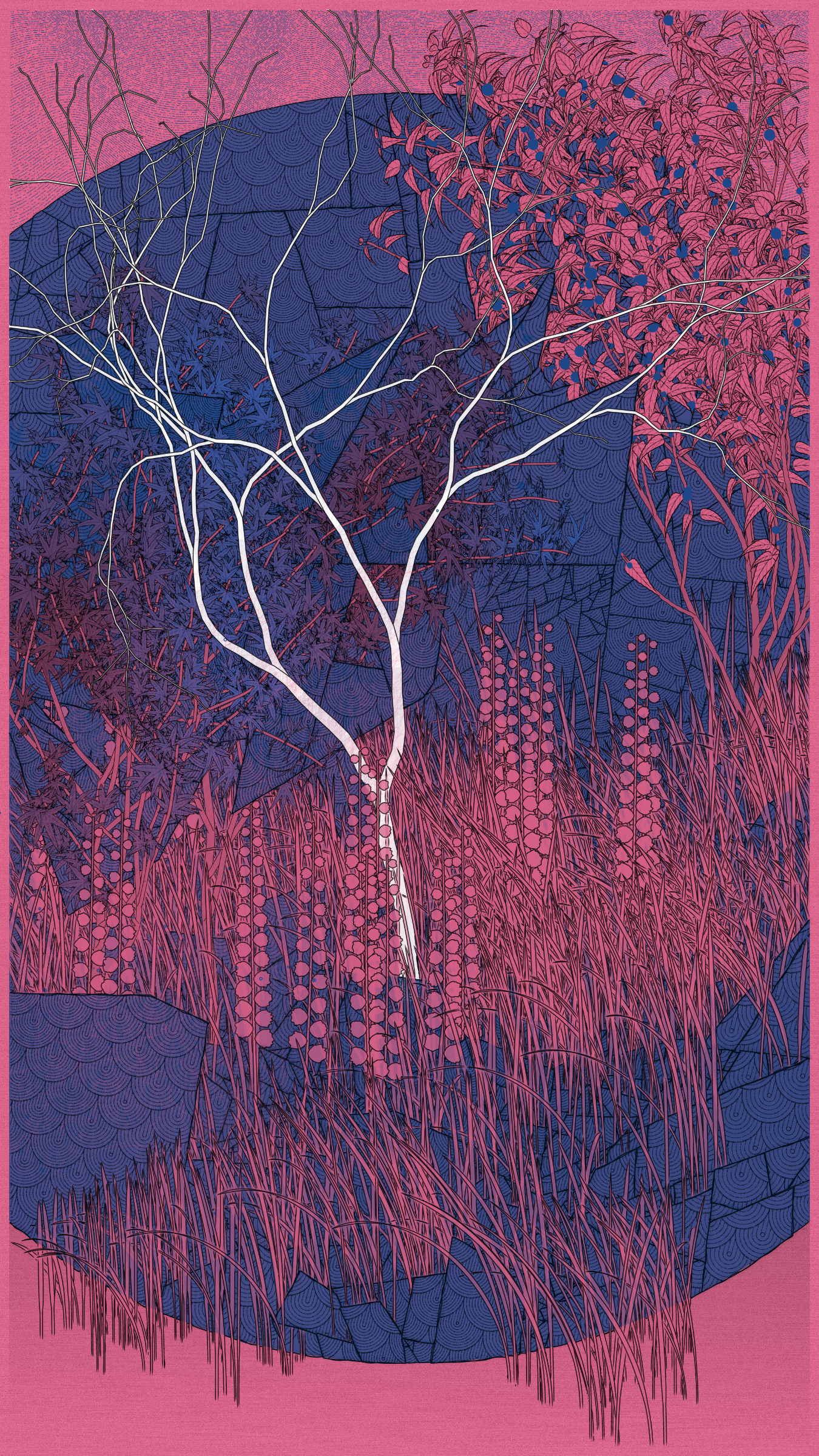 How can one create a work inspired by a city where one has never set foot? Moreover, a place on the other side of the world, whose history and cultural richness are of such dizzying density? I quickly realized that my work could only be imagined, dreamed, imbued with my Western culture, tinged with my distant prejudices. I worked with a visual approach above all, around a few chosen colors, representative tree species, and some clichéd symbols: for example, the composition is organized around 3 abstract shapes, including the circle, directly inspired by the rising sun on the flag, the rectangular shape of a kakemono, or a cityscape.