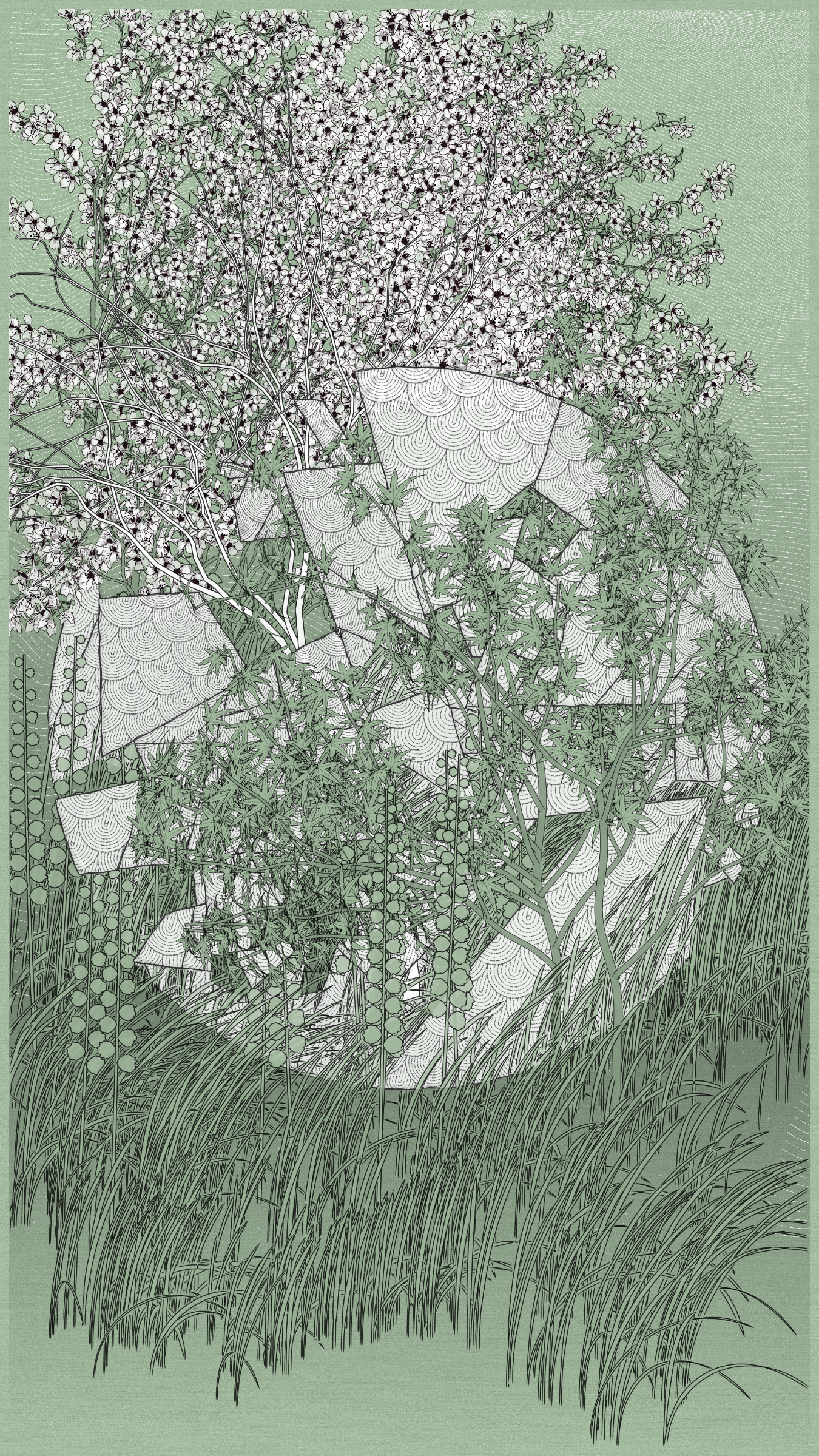 How can one create a work inspired by a city where one has never set foot? Moreover, a place on the other side of the world, whose history and cultural richness are of such dizzying density? I quickly realized that my work could only be imagined, dreamed, imbued with my Western culture, tinged with my distant prejudices. I worked with a visual approach above all, around a few chosen colors, representative tree species, and some clichéd symbols: for example, the composition is organized around 3 abstract shapes, including the circle, directly inspired by the rising sun on the flag, the rectangular shape of a kakemono, or a cityscape.
