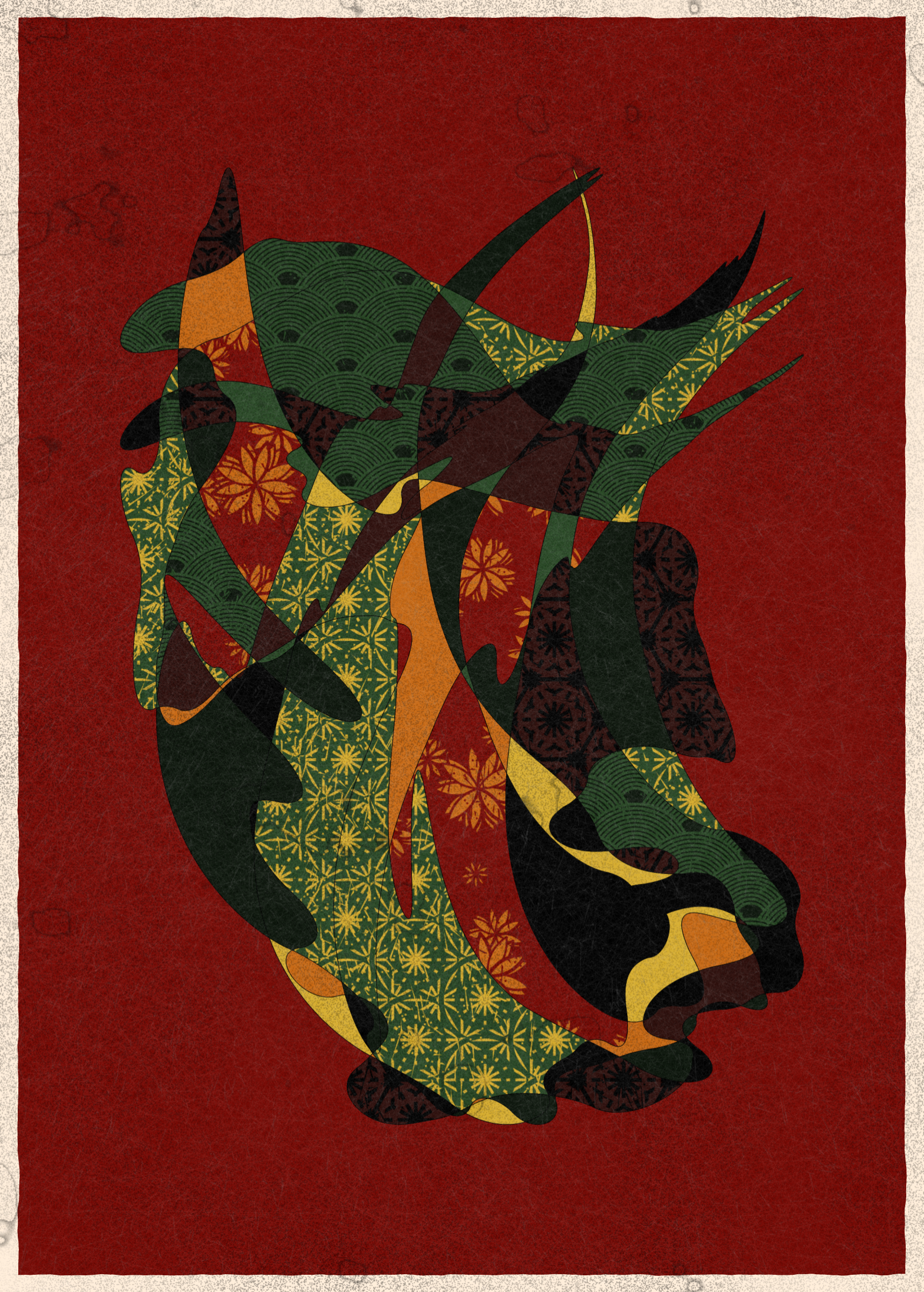 Memories of Qilin is inspired by traditional East Asian art. It channels the sense of movement and fluidity found in classical Chinese brushwork, while drawing from the colors, patterns, and forms of ukiyo-e woodblock prints.