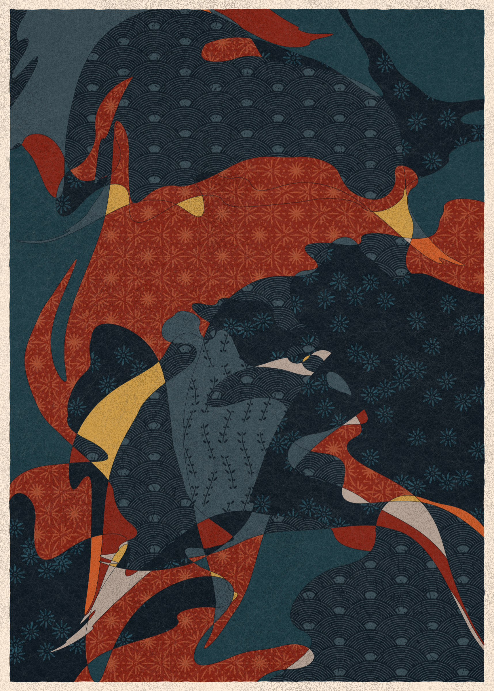 Memories of Qilin is inspired by traditional East Asian art. It channels the sense of movement and fluidity found in classical Chinese brushwork, while drawing from the colors, patterns, and forms of ukiyo-e woodblock prints.