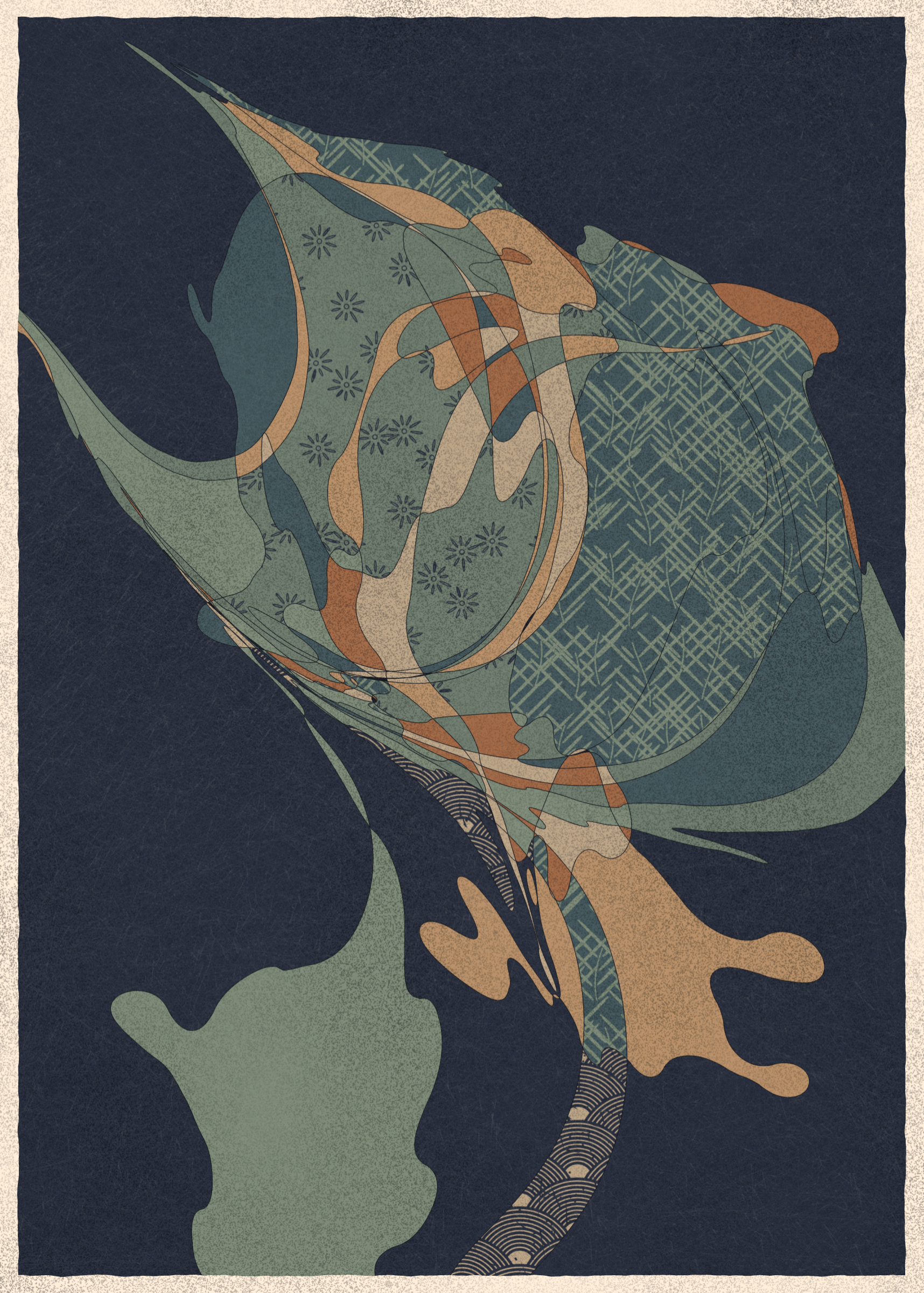 Memories of Qilin is inspired by traditional East Asian art. It channels the sense of movement and fluidity found in classical Chinese brushwork, while drawing from the colors, patterns, and forms of ukiyo-e woodblock prints.