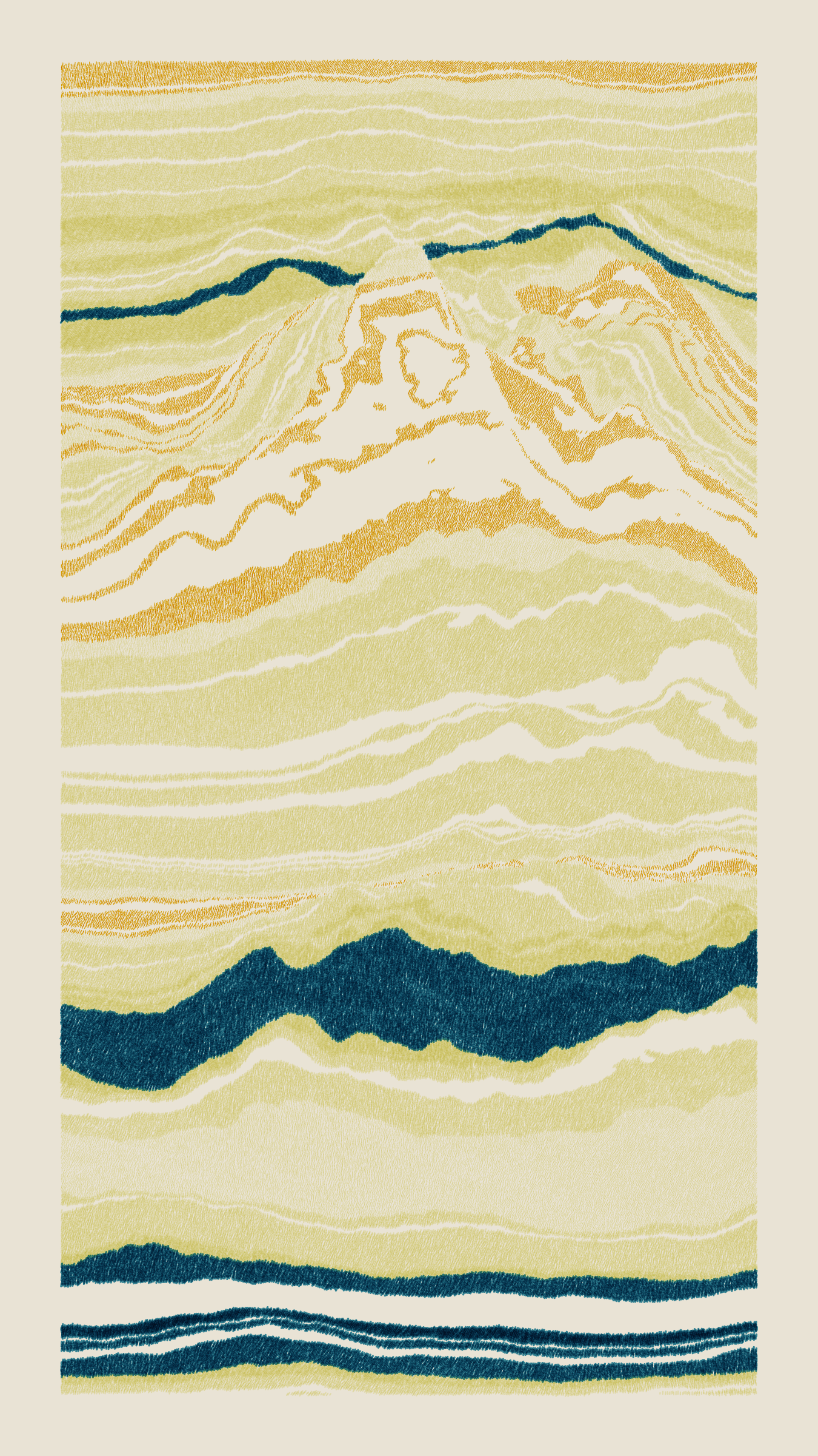 Stratified landforms constructed from many small strokes of colour. The hash of each token describes a coordinate within a multidimensional generative space, locating a unique composition that lies along one of many possible longitudes.