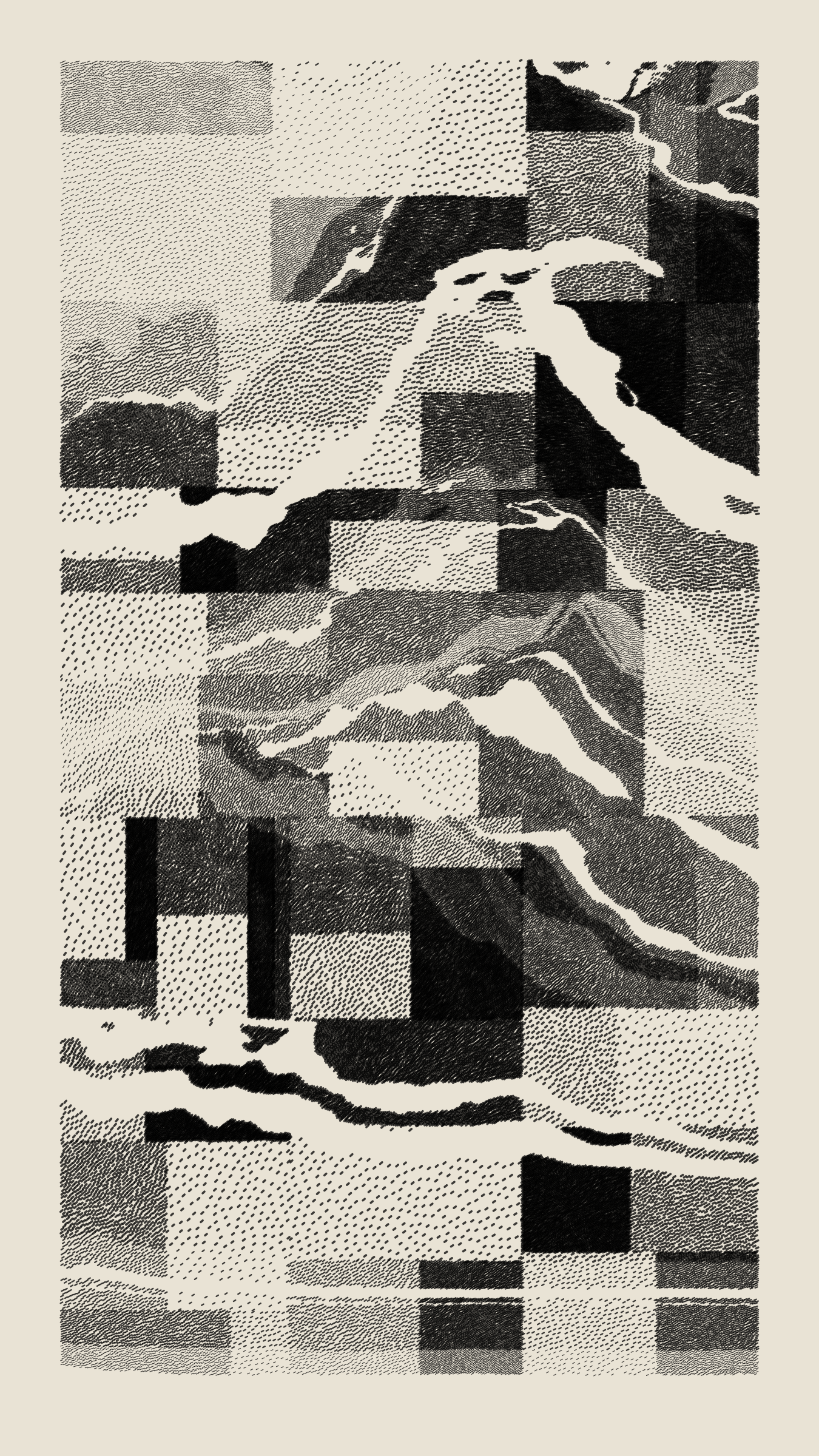 Stratified landforms constructed from many small strokes of colour. The hash of each token describes a coordinate within a multidimensional generative space, locating a unique composition that lies along one of many possible longitudes.