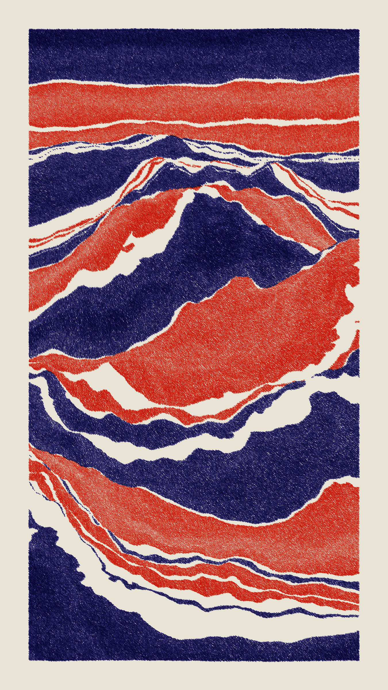 Stratified landforms constructed from many small strokes of colour. The hash of each token describes a coordinate within a multidimensional generative space, locating a unique composition that lies along one of many possible longitudes.