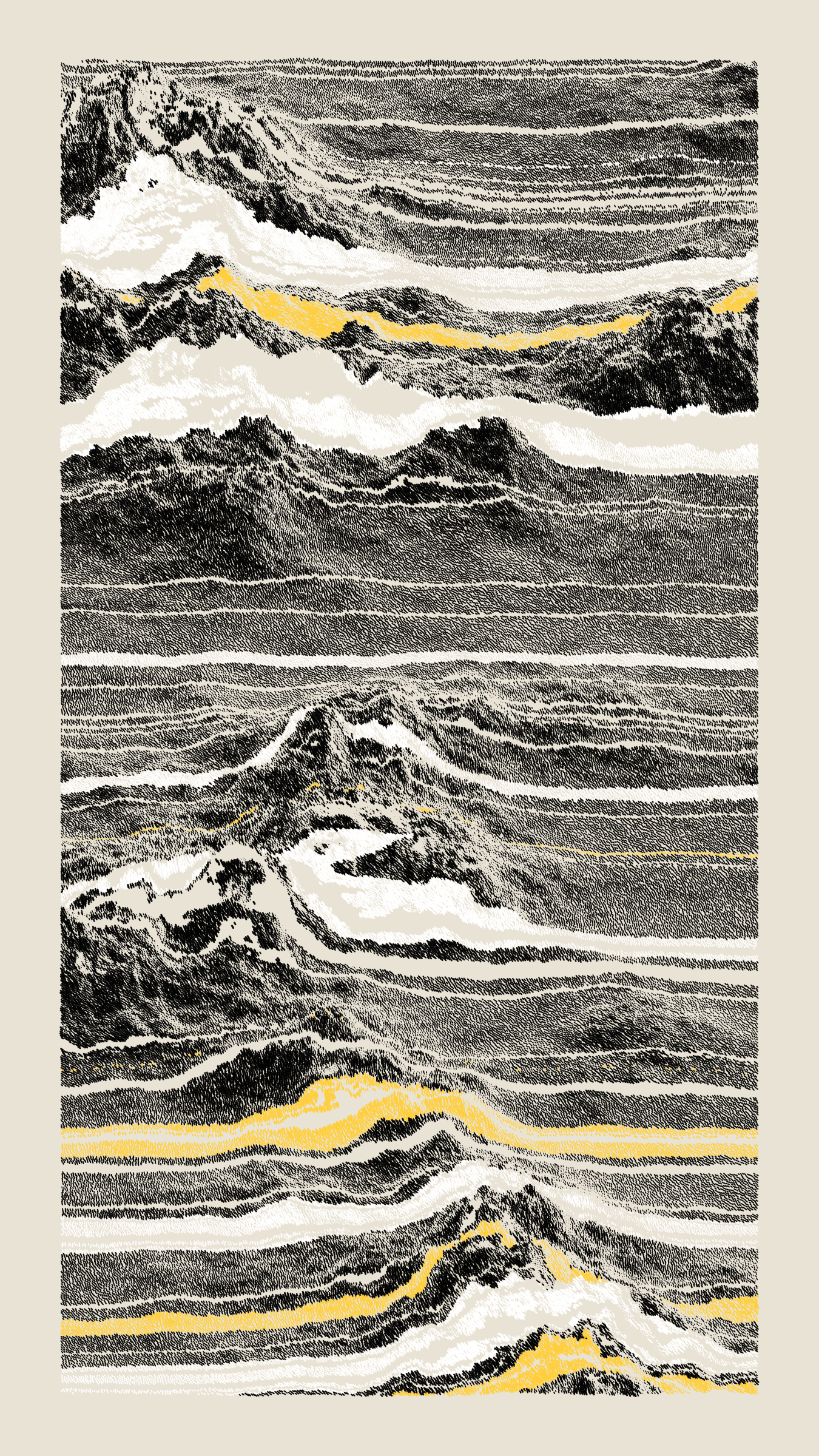 Stratified landforms constructed from many small strokes of colour. The hash of each token describes a coordinate within a multidimensional generative space, locating a unique composition that lies along one of many possible longitudes.