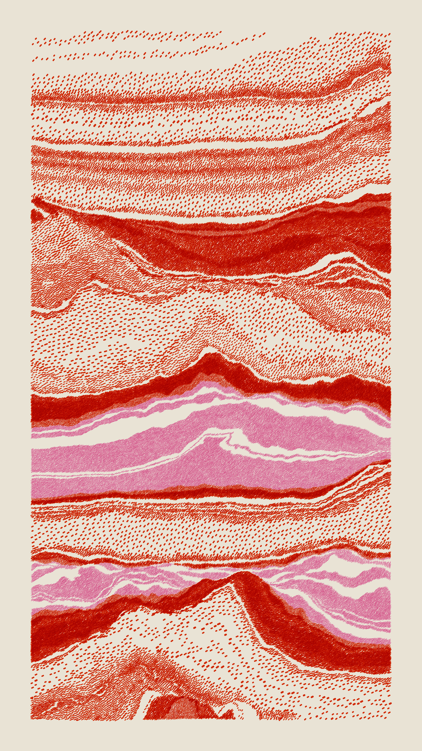 Stratified landforms constructed from many small strokes of colour. The hash of each token describes a coordinate within a multidimensional generative space, locating a unique composition that lies along one of many possible longitudes.