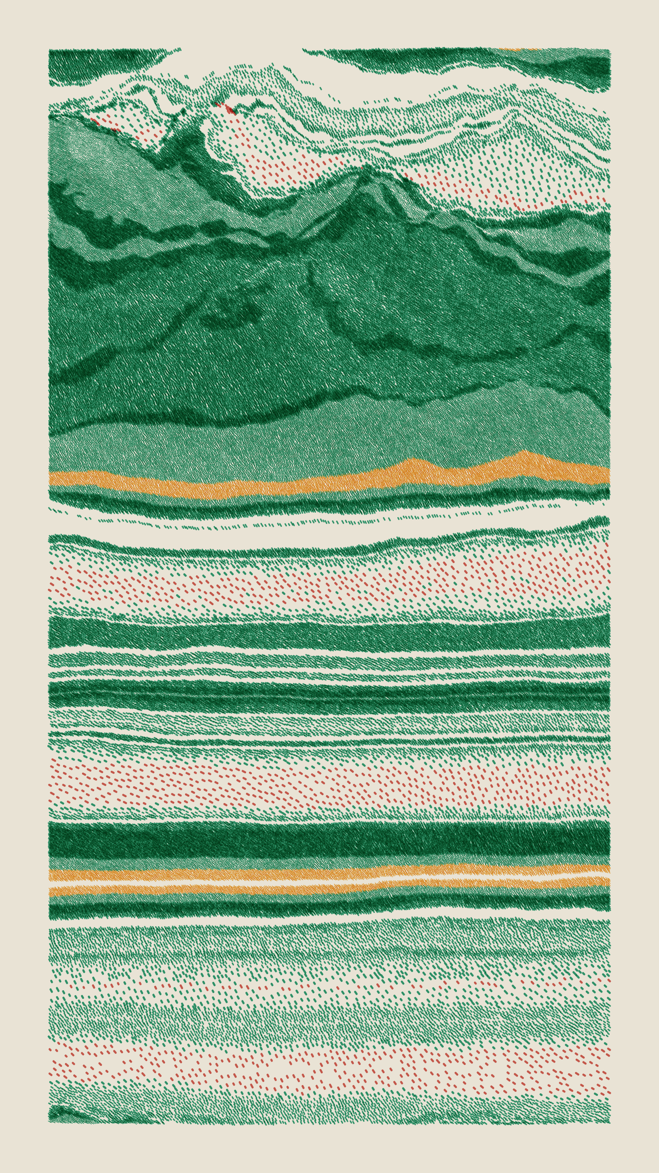Stratified landforms constructed from many small strokes of colour. The hash of each token describes a coordinate within a multidimensional generative space, locating a unique composition that lies along one of many possible longitudes.