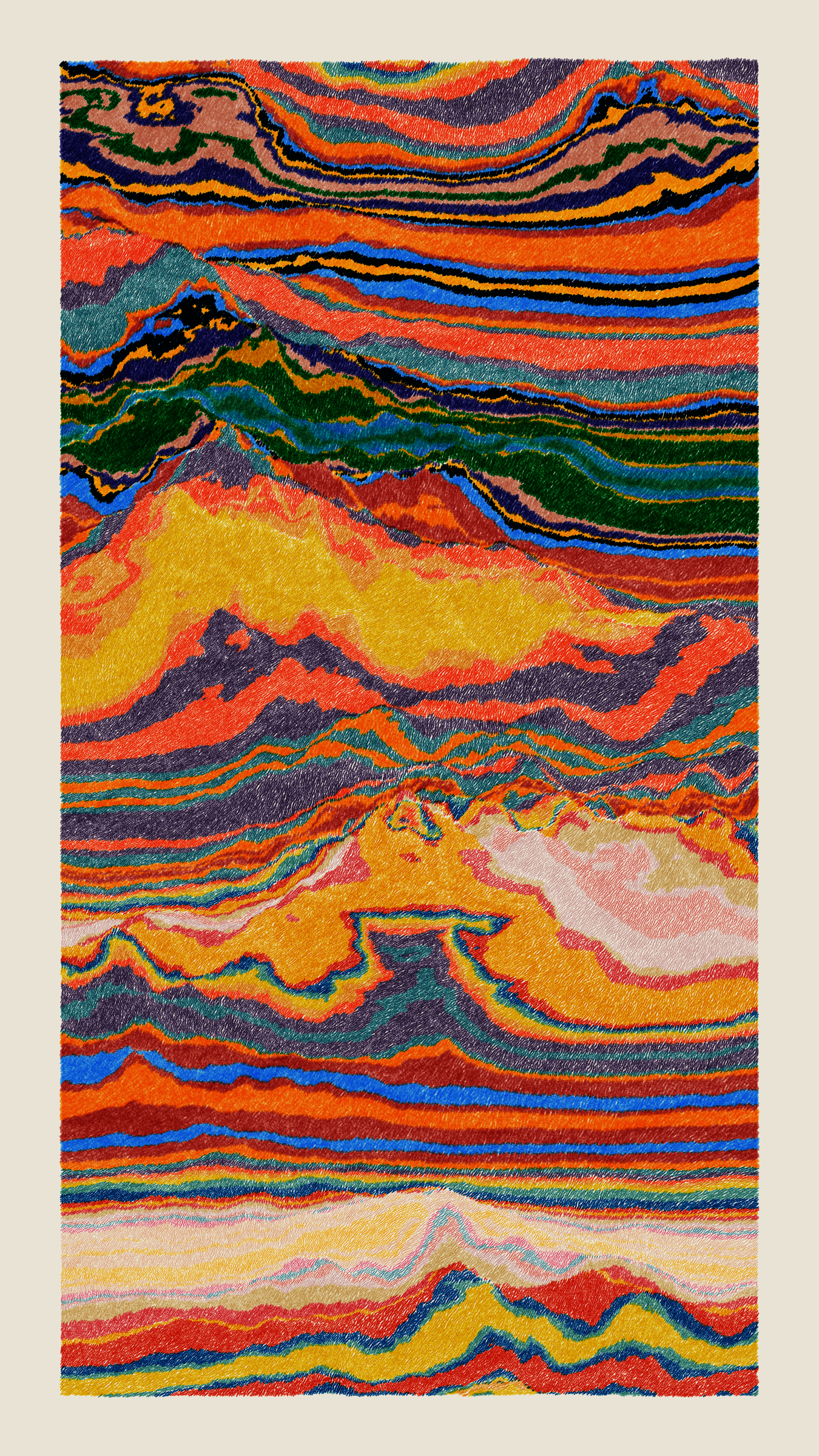 Stratified landforms constructed from many small strokes of colour. The hash of each token describes a coordinate within a multidimensional generative space, locating a unique composition that lies along one of many possible longitudes.