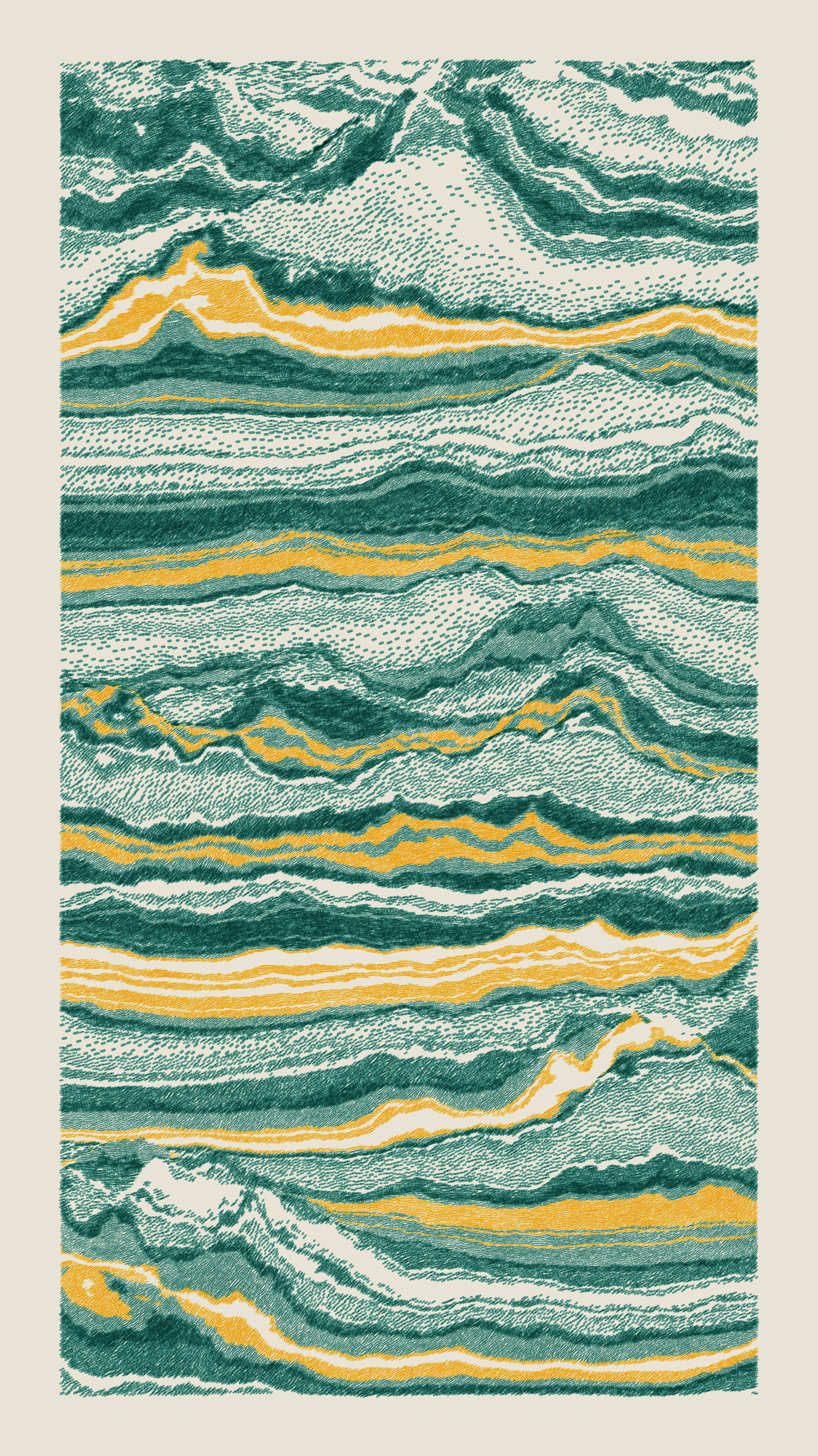 Stratified landforms constructed from many small strokes of colour. The hash of each token describes a coordinate within a multidimensional generative space, locating a unique composition that lies along one of many possible longitudes.