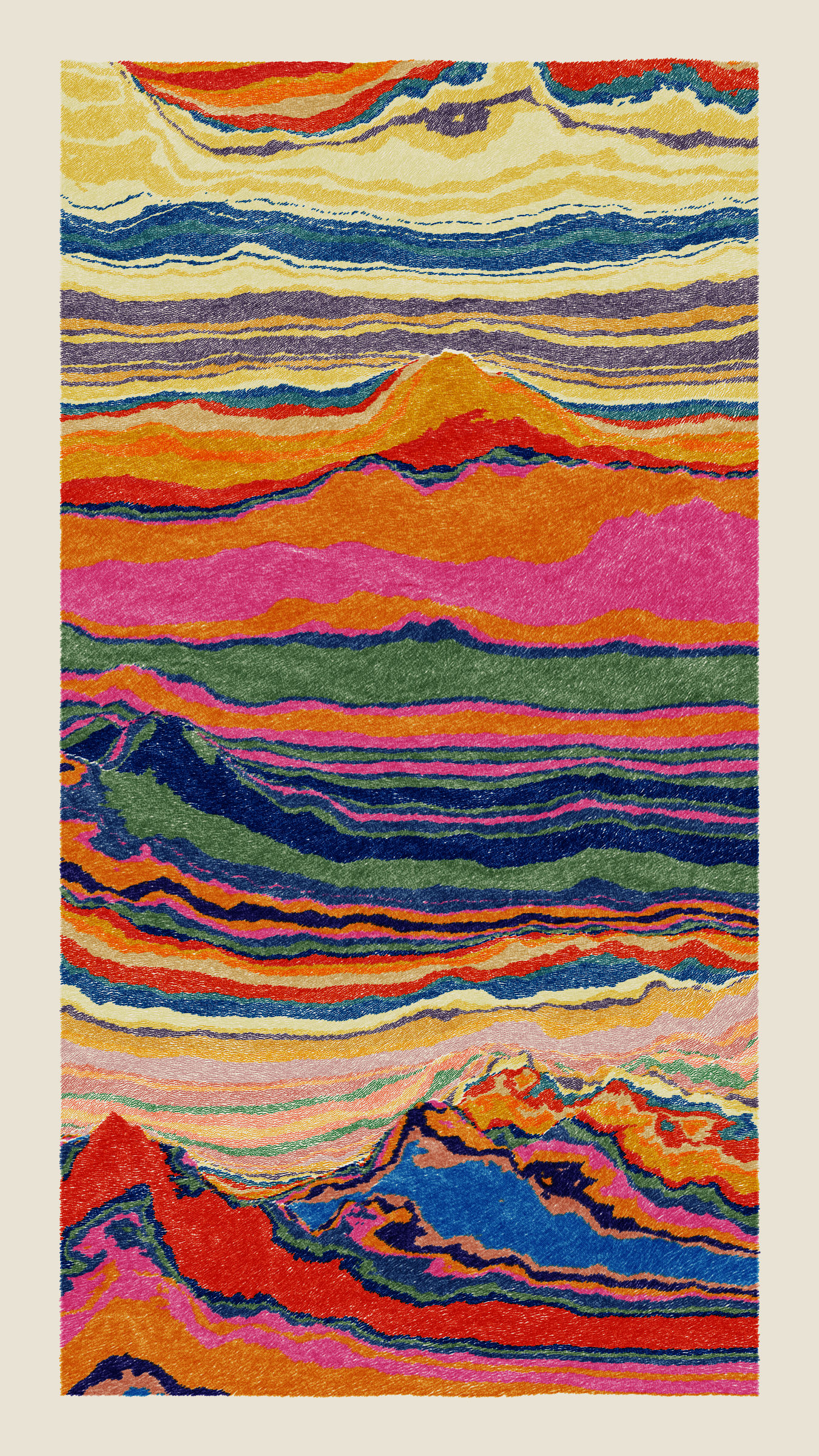 Stratified landforms constructed from many small strokes of colour. The hash of each token describes a coordinate within a multidimensional generative space, locating a unique composition that lies along one of many possible longitudes.