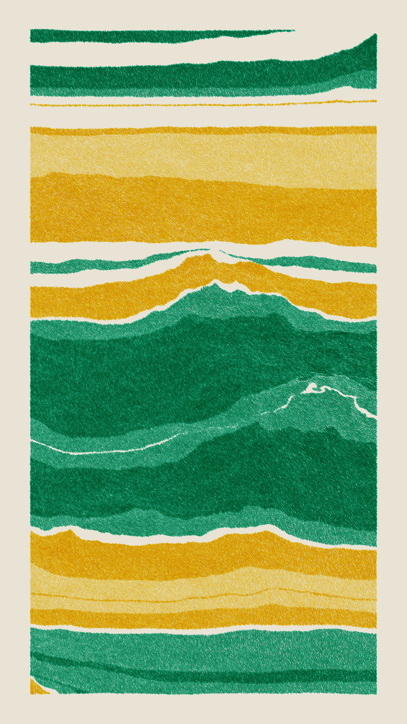 Stratified landforms constructed from many small strokes of colour. The hash of each token describes a coordinate within a multidimensional generative space, locating a unique composition that lies along one of many possible longitudes.