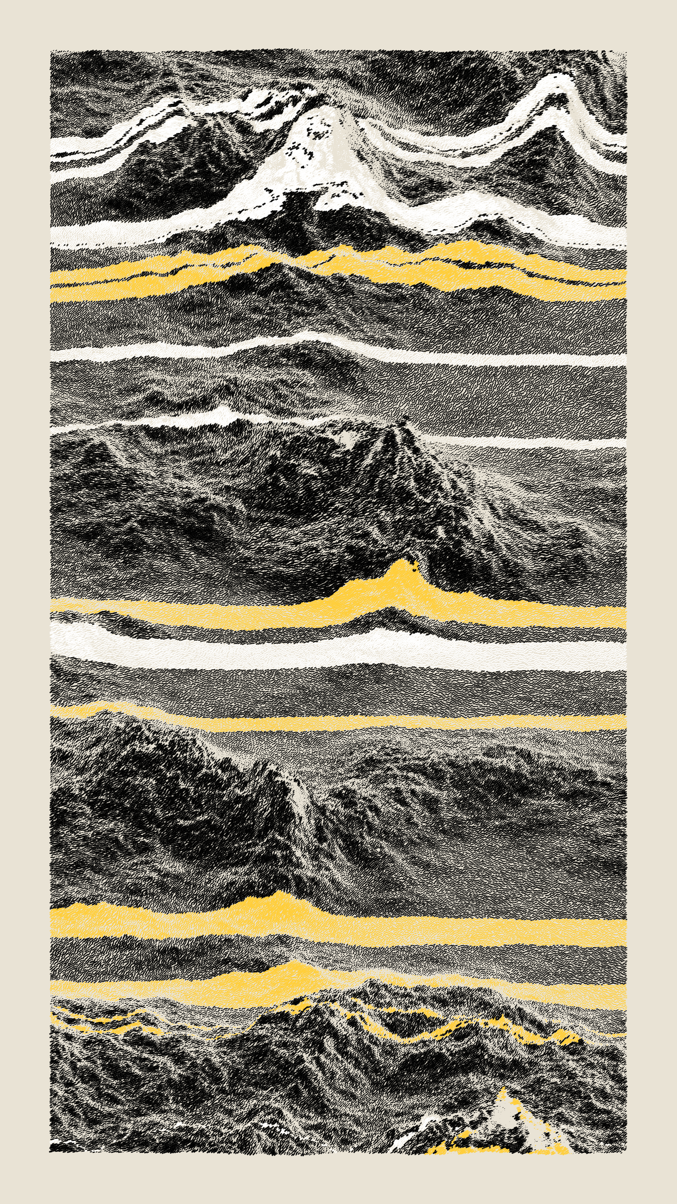 Stratified landforms constructed from many small strokes of colour. The hash of each token describes a coordinate within a multidimensional generative space, locating a unique composition that lies along one of many possible longitudes.