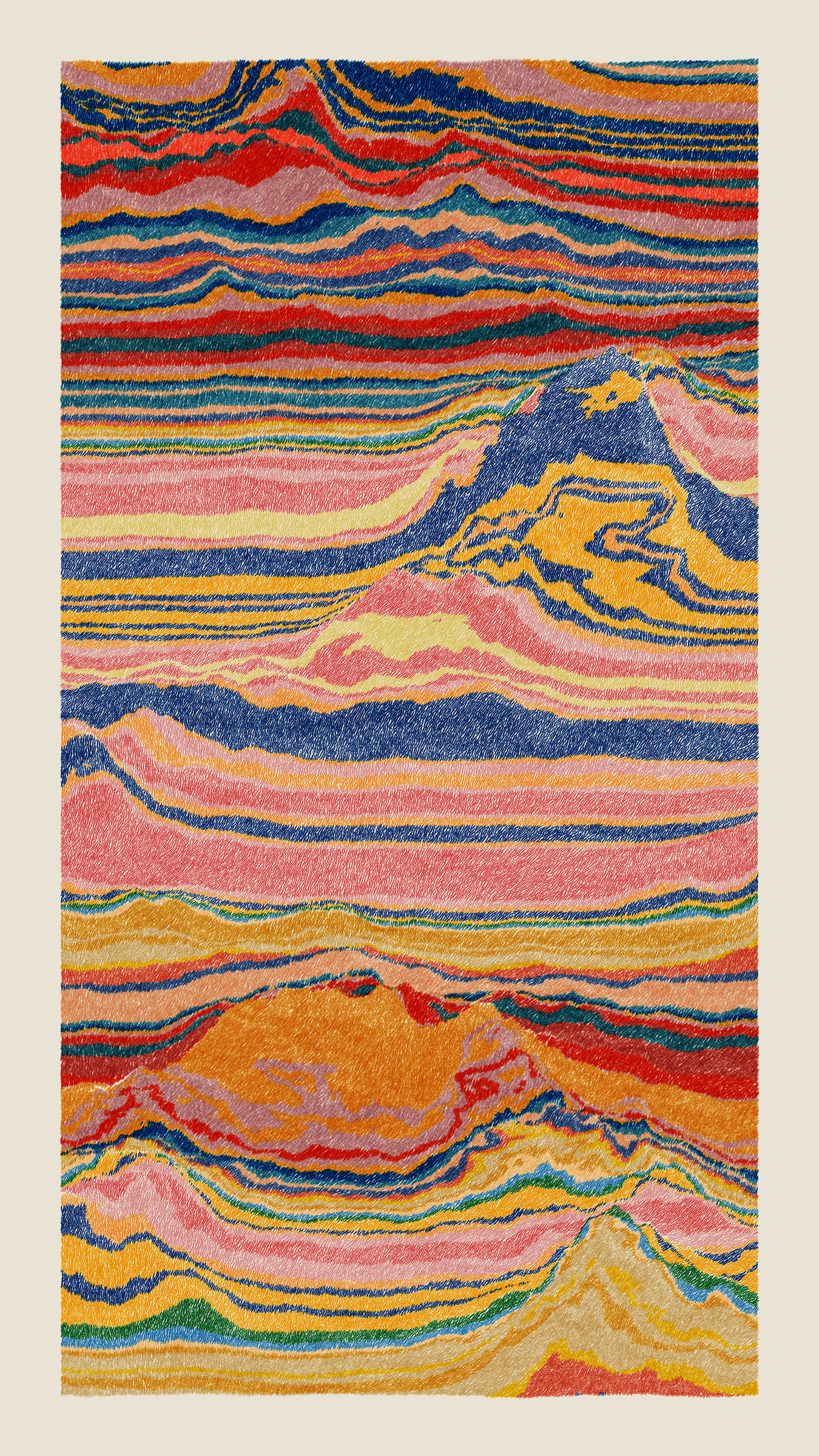 Stratified landforms constructed from many small strokes of colour. The hash of each token describes a coordinate within a multidimensional generative space, locating a unique composition that lies along one of many possible longitudes.