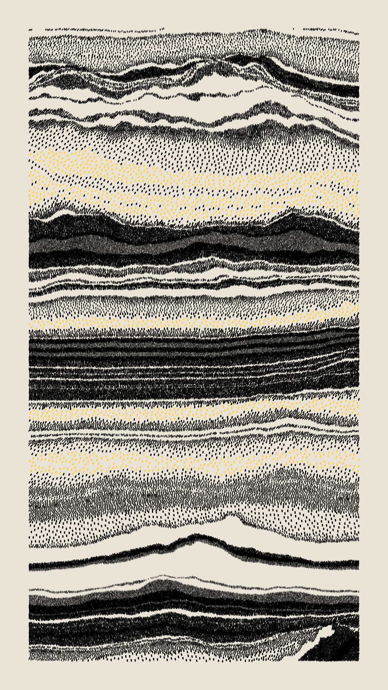 Stratified landforms constructed from many small strokes of colour. The hash of each token describes a coordinate within a multidimensional generative space, locating a unique composition that lies along one of many possible longitudes.