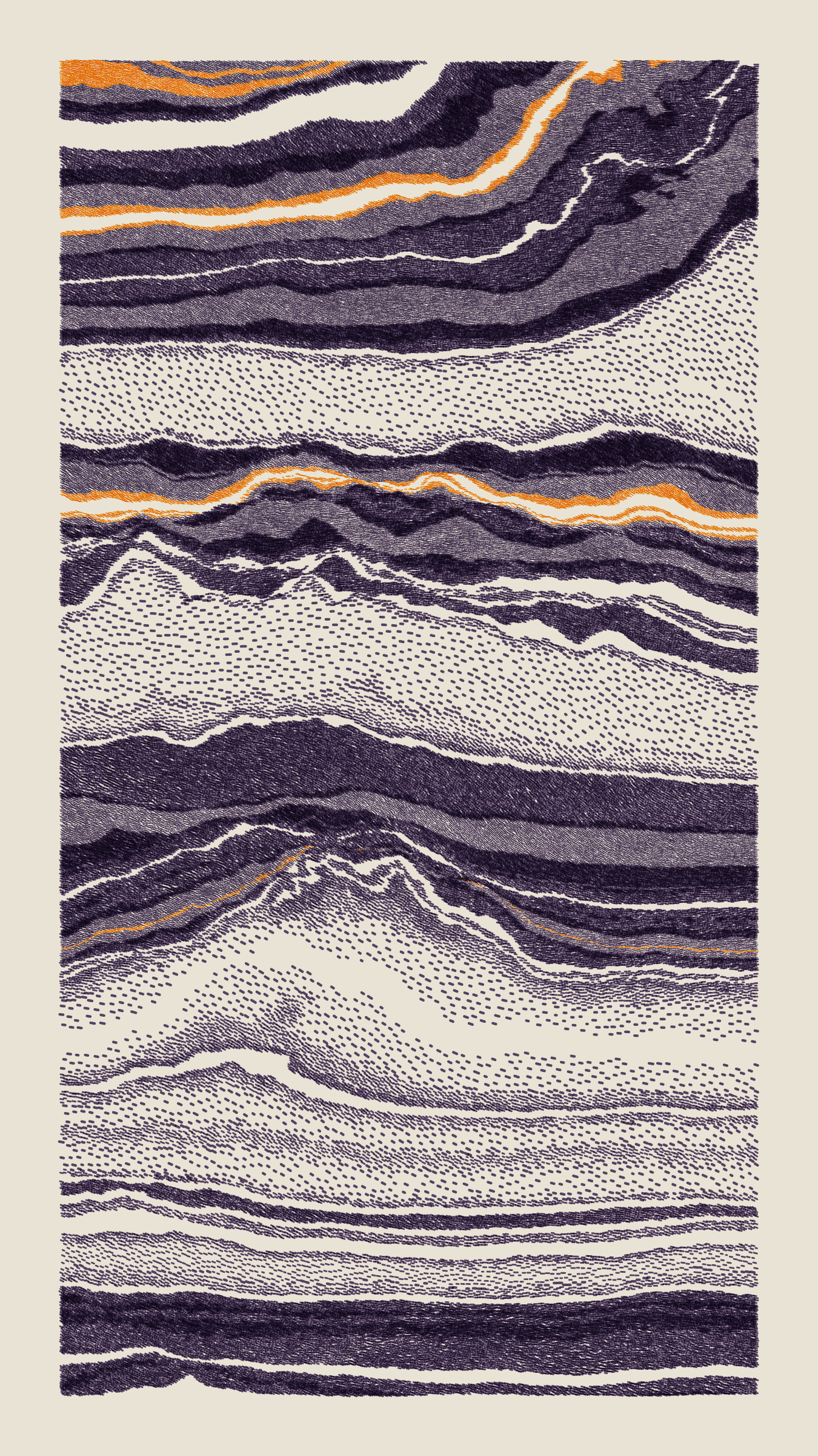 Stratified landforms constructed from many small strokes of colour. The hash of each token describes a coordinate within a multidimensional generative space, locating a unique composition that lies along one of many possible longitudes.