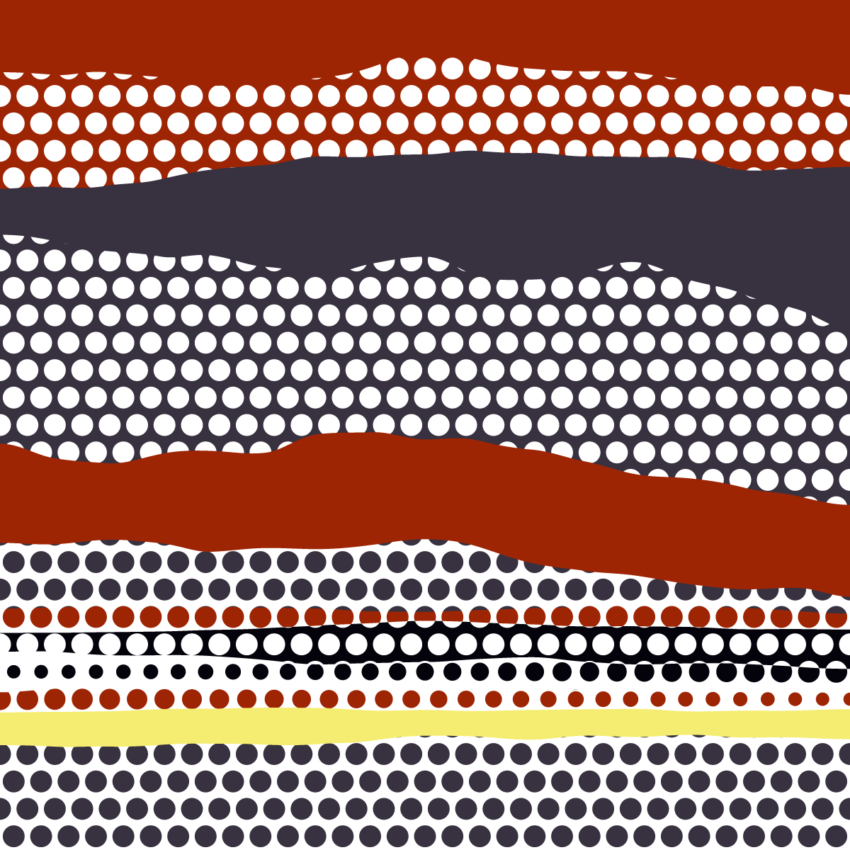 An ode to Roy Lichtenstein, incorporating his iconic version of Ben-Day dots, halftone dots, angled stripes, and solid color patches. Inspired by Roy's sea and landscape paintings, each artwork generates a unique combination of patterns, shapes, and colors.