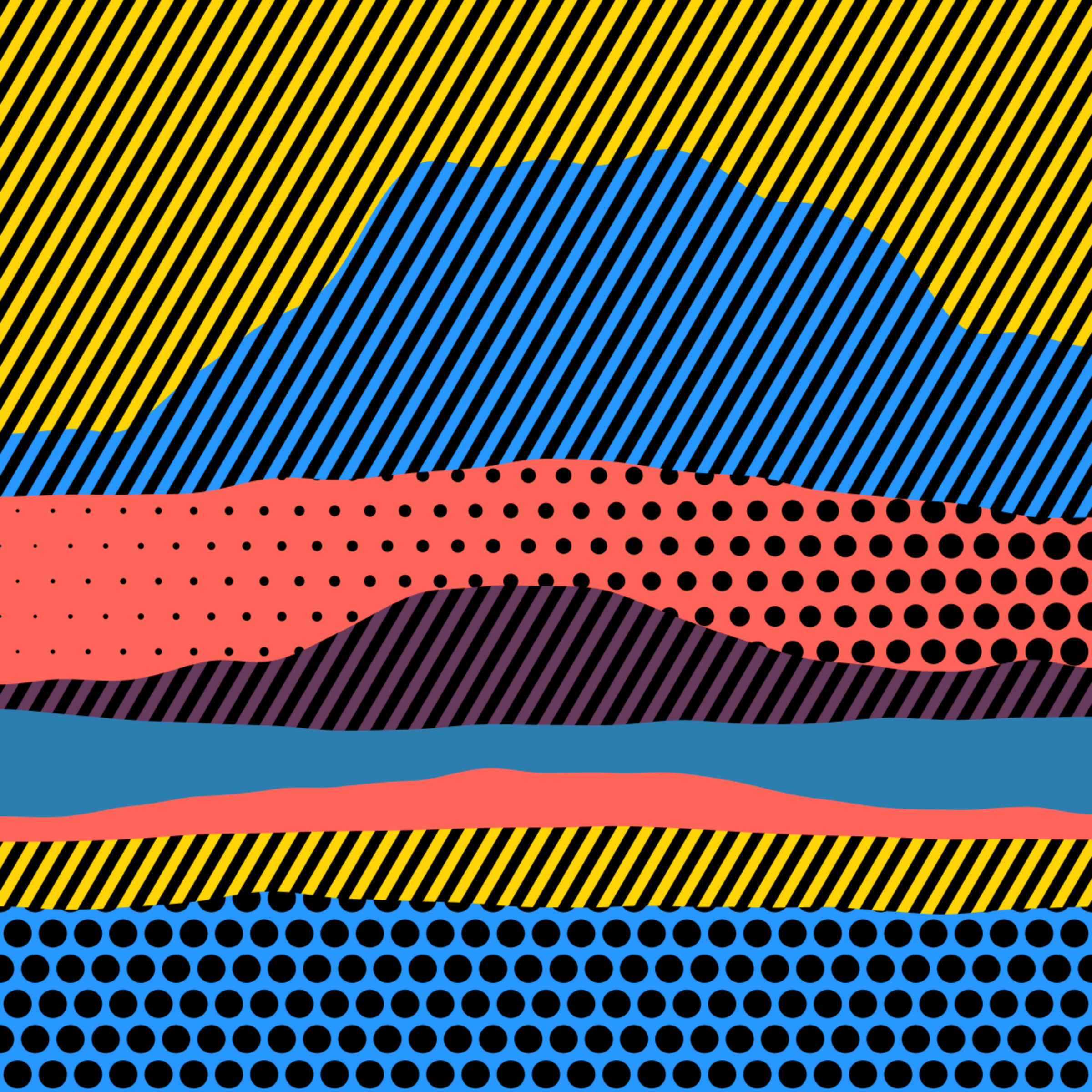 An ode to Roy Lichtenstein, incorporating his iconic version of Ben-Day dots, halftone dots, angled stripes, and solid color patches. Inspired by Roy's sea and landscape paintings, each artwork generates a unique combination of patterns, shapes, and colors.