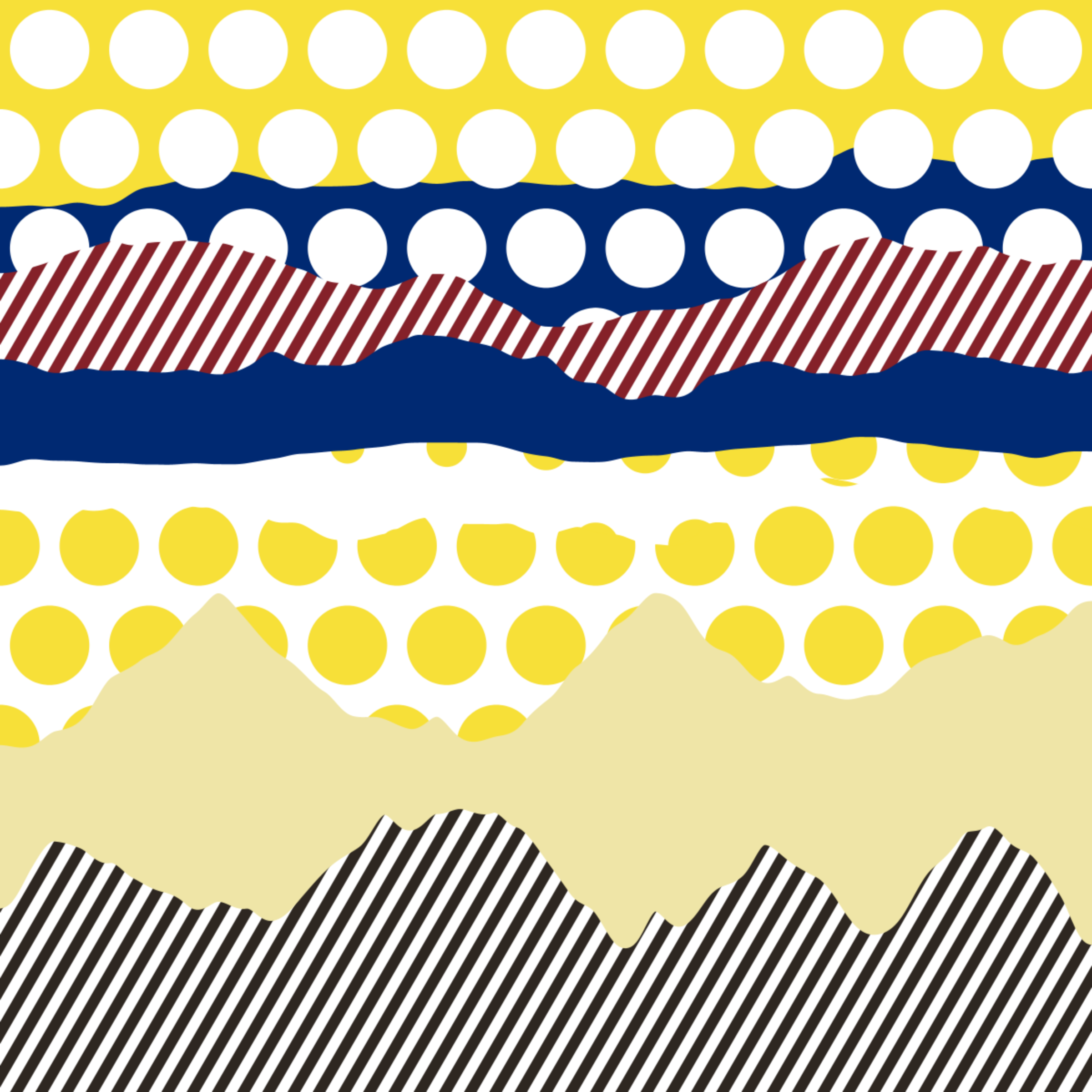 An ode to Roy Lichtenstein, incorporating his iconic version of Ben-Day dots, halftone dots, angled stripes, and solid color patches. Inspired by Roy's sea and landscape paintings, each artwork generates a unique combination of patterns, shapes, and colors.