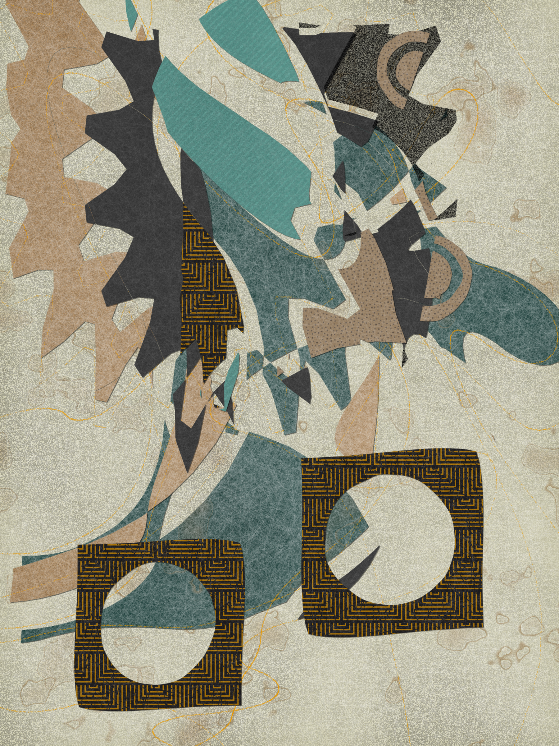 Much like the practice of collage itself, *Off Script* elicits a deeply sensorial experience. Generative textures induce a sense of tactility, while askew jagged shapes evoke the punctuated off-beat sounds of jazz. With its synesthetic qualities, the series challenges its own medium, creating a dialogue between the immateriality of digital representation and the corporality of the physical realm.