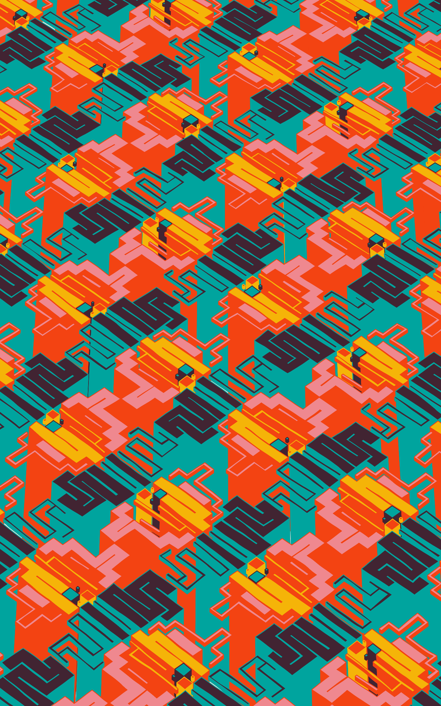 This project explores the visual expression of various planar symmetries by using colourful, maze-like structures. The precision of these mathematical patterns are offset by a playful use of dimensionality and an imperfect grid as basis for the linework.