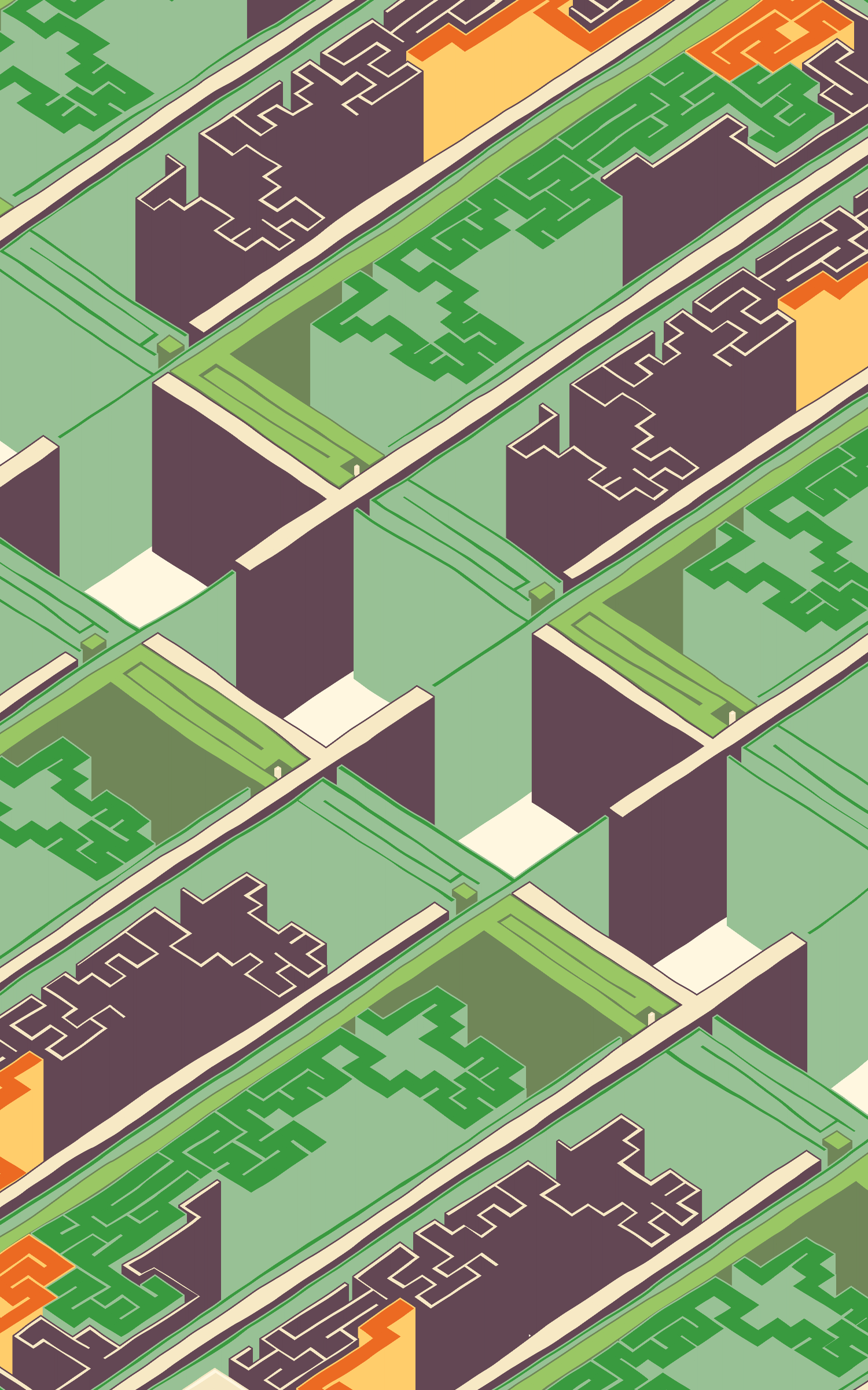 This project explores the visual expression of various planar symmetries by using colourful, maze-like structures. The precision of these mathematical patterns are offset by a playful use of dimensionality and an imperfect grid as basis for the linework.