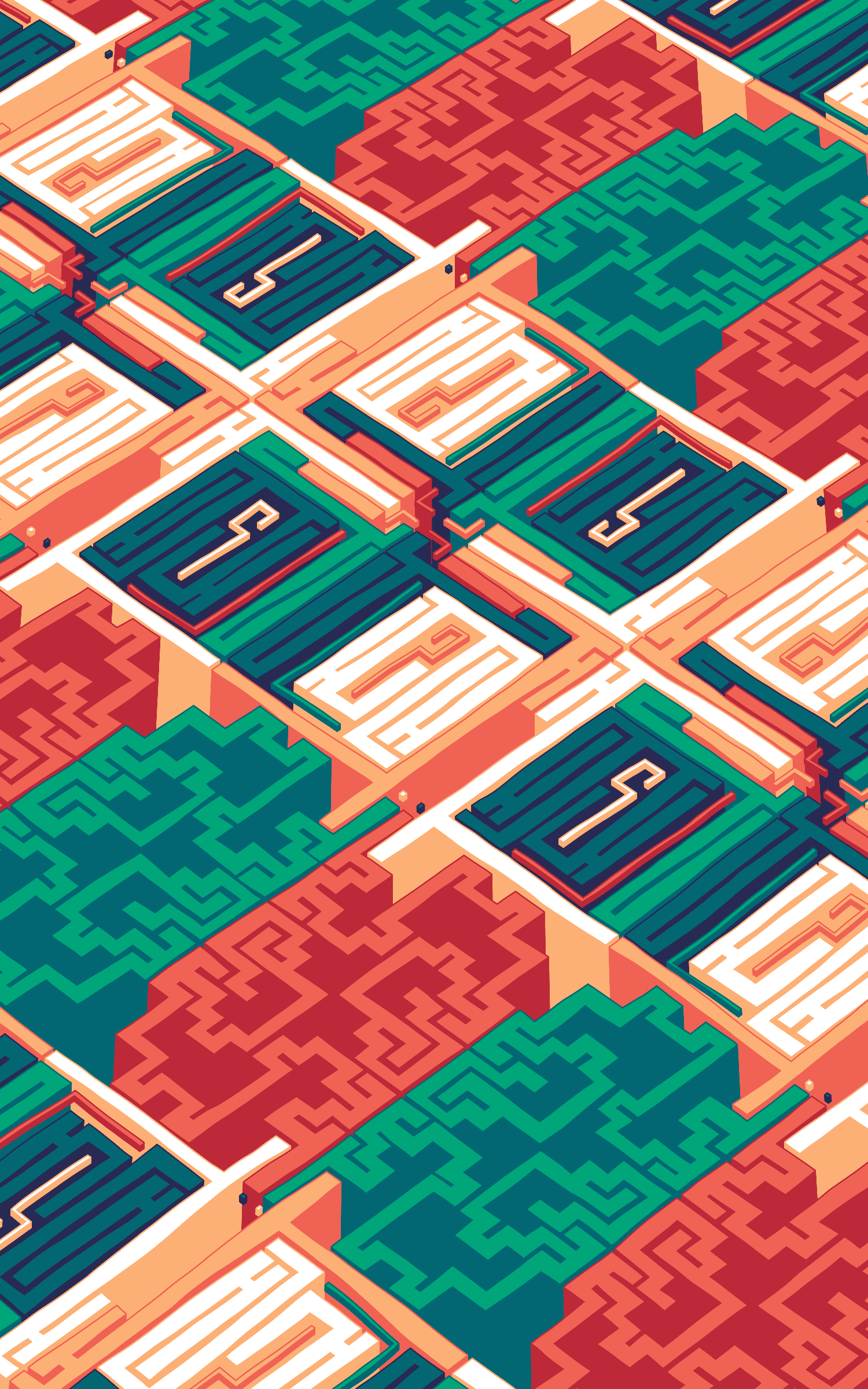 This project explores the visual expression of various planar symmetries by using colourful, maze-like structures. The precision of these mathematical patterns are offset by a playful use of dimensionality and an imperfect grid as basis for the linework.