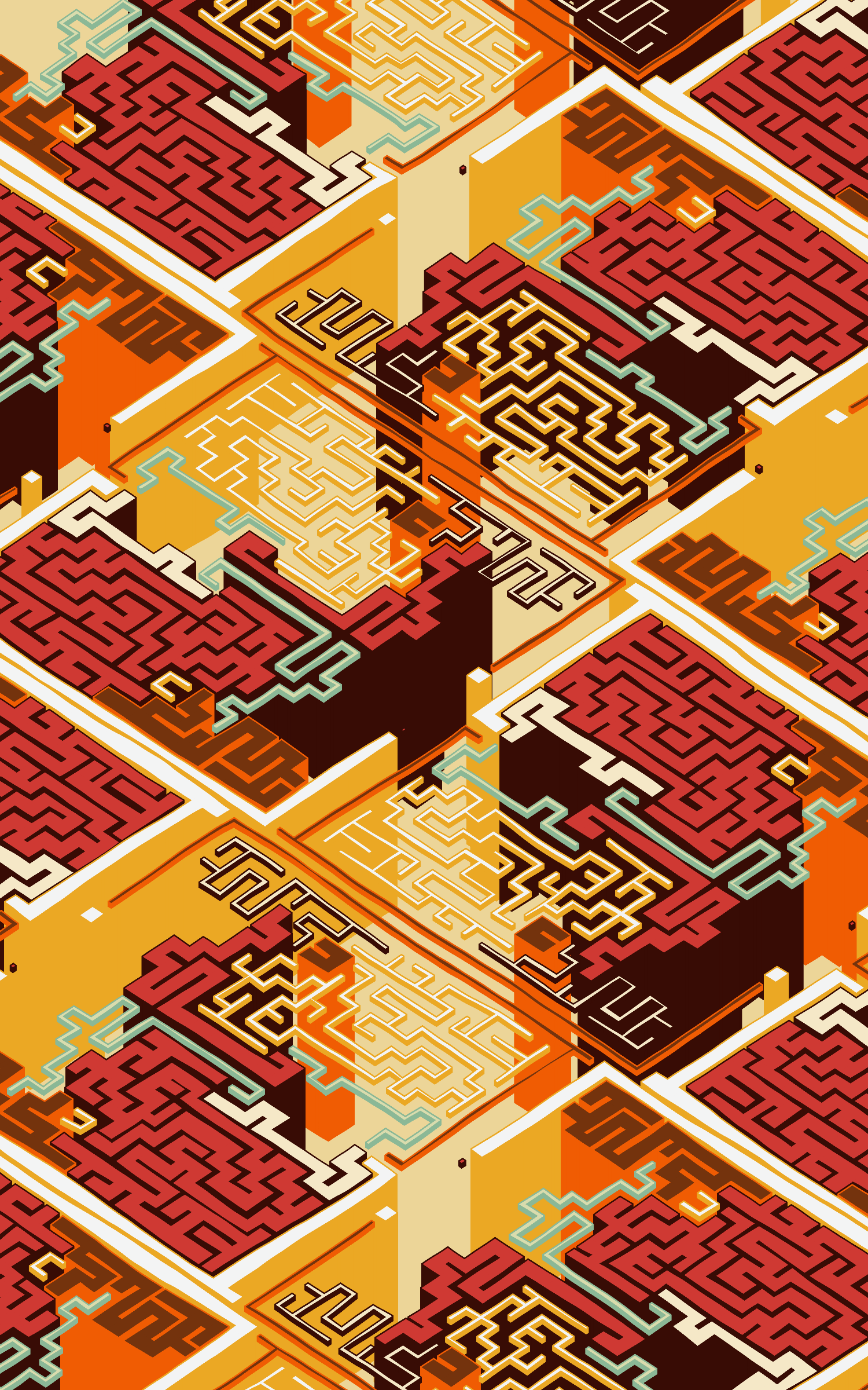 This project explores the visual expression of various planar symmetries by using colourful, maze-like structures. The precision of these mathematical patterns are offset by a playful use of dimensionality and an imperfect grid as basis for the linework.