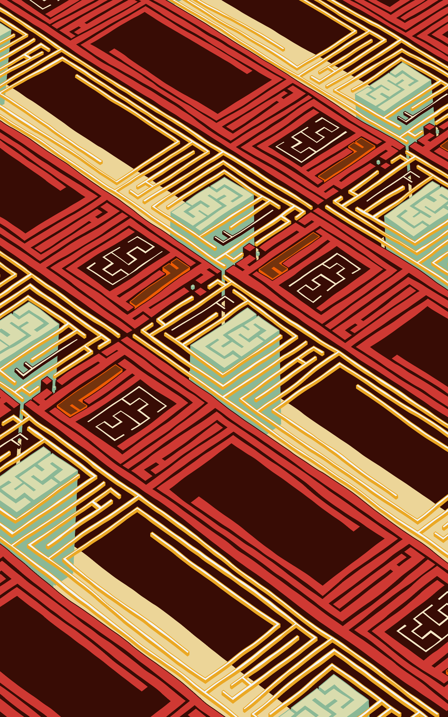 This project explores the visual expression of various planar symmetries by using colourful, maze-like structures. The precision of these mathematical patterns are offset by a playful use of dimensionality and an imperfect grid as basis for the linework.