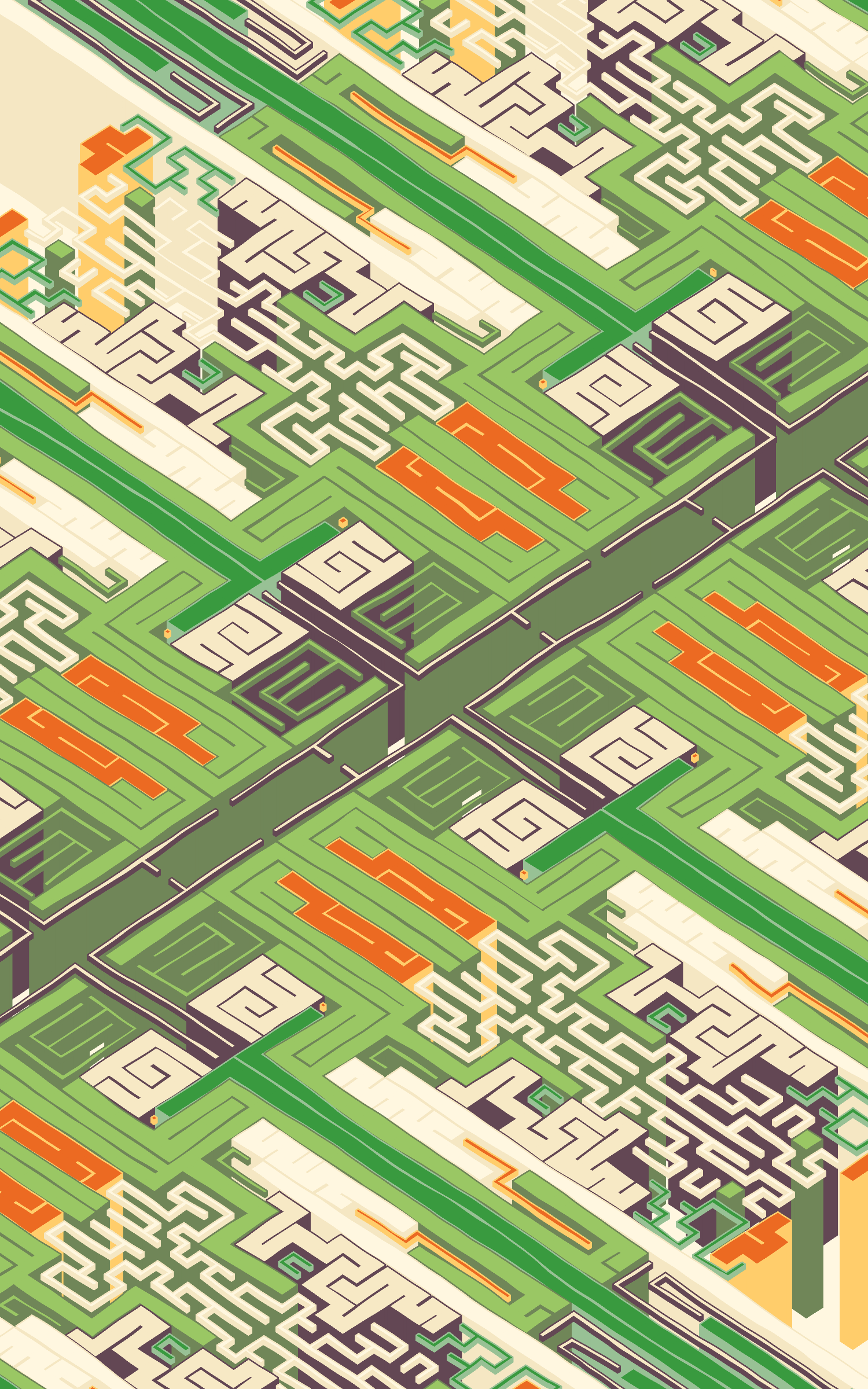 This project explores the visual expression of various planar symmetries by using colourful, maze-like structures. The precision of these mathematical patterns are offset by a playful use of dimensionality and an imperfect grid as basis for the linework.