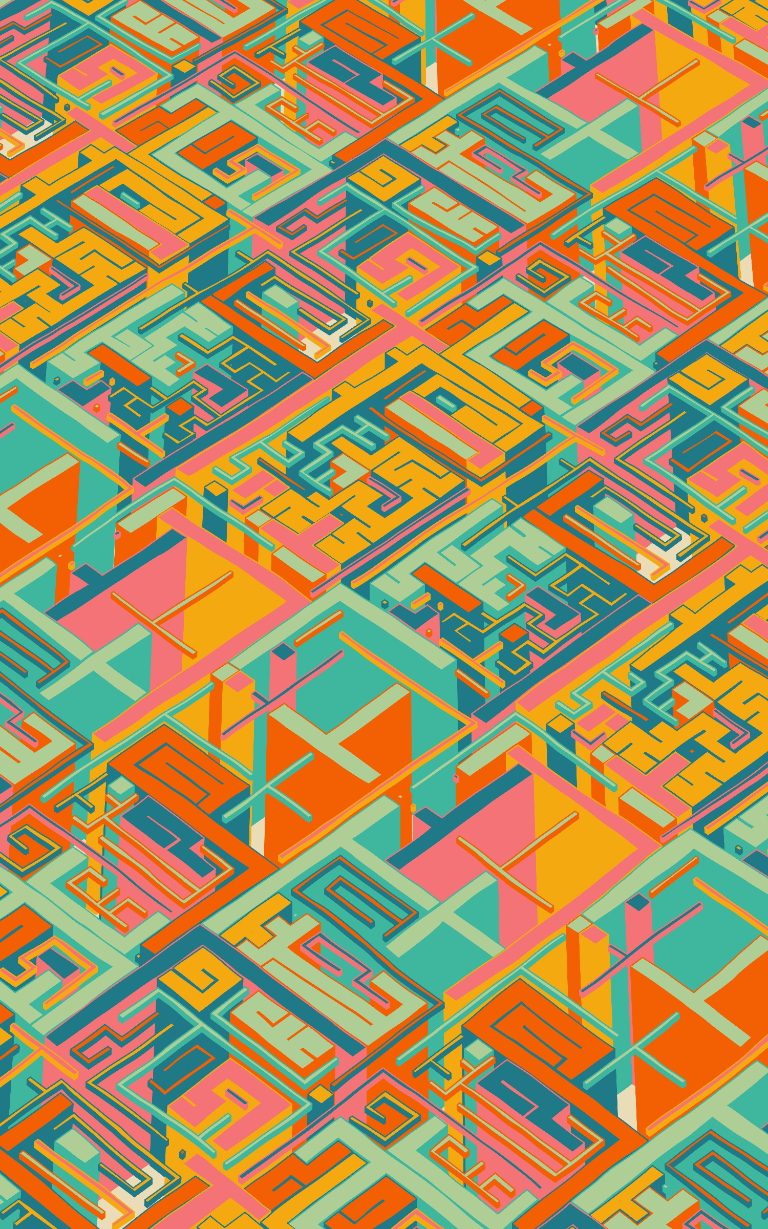 This project explores the visual expression of various planar symmetries by using colourful, maze-like structures. The precision of these mathematical patterns are offset by a playful use of dimensionality and an imperfect grid as basis for the linework.
