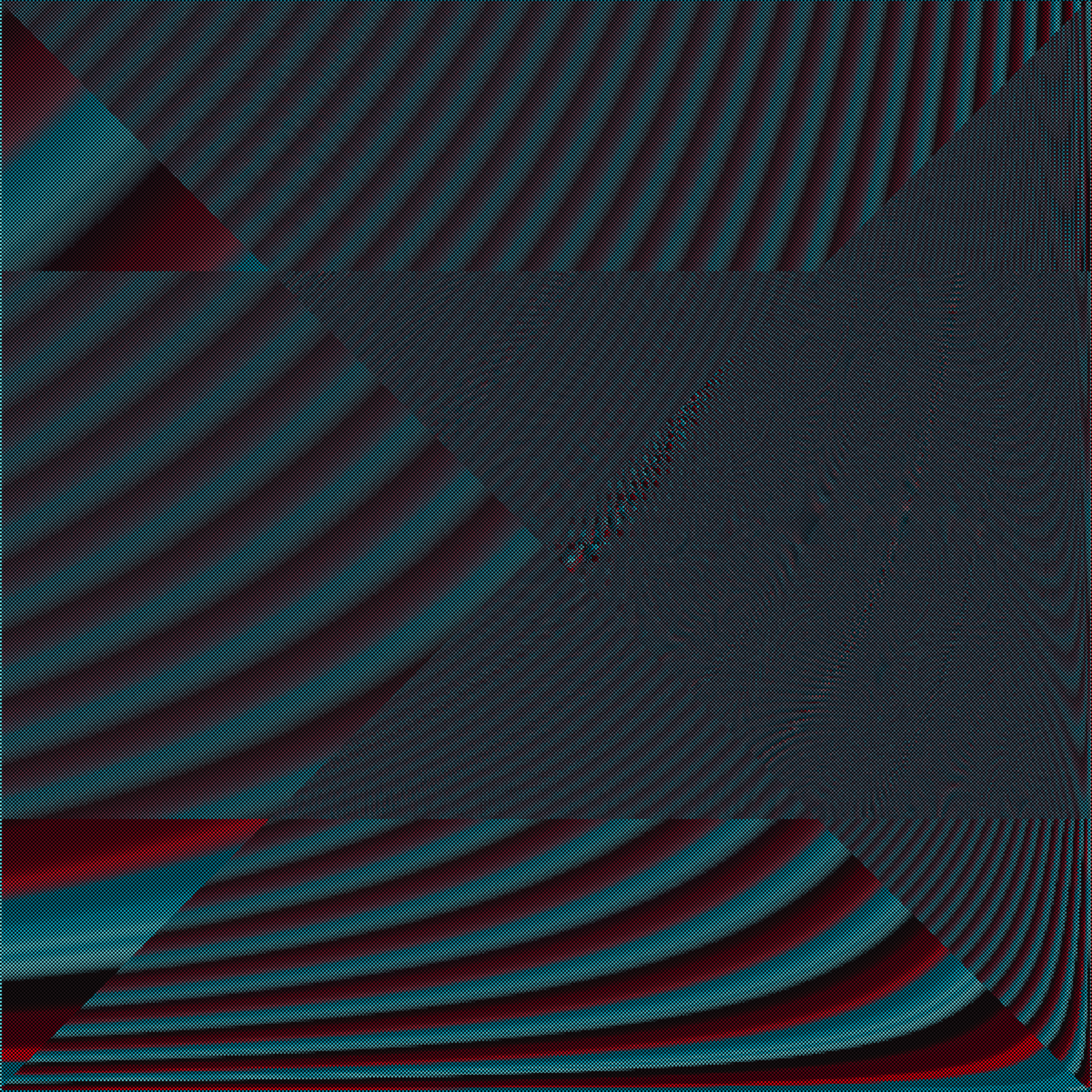 This project is a visual representation of realities that are out of phase. Interference patterns, colorful echoes, and emerging secrets are explored. Mathematical functions produce constant motion, but rarely, a peaceful scene resolves within the chaos. Click or press any key to pause. *Photosensitive seizure warning: These artworks contain flashing colors and moving patterns.