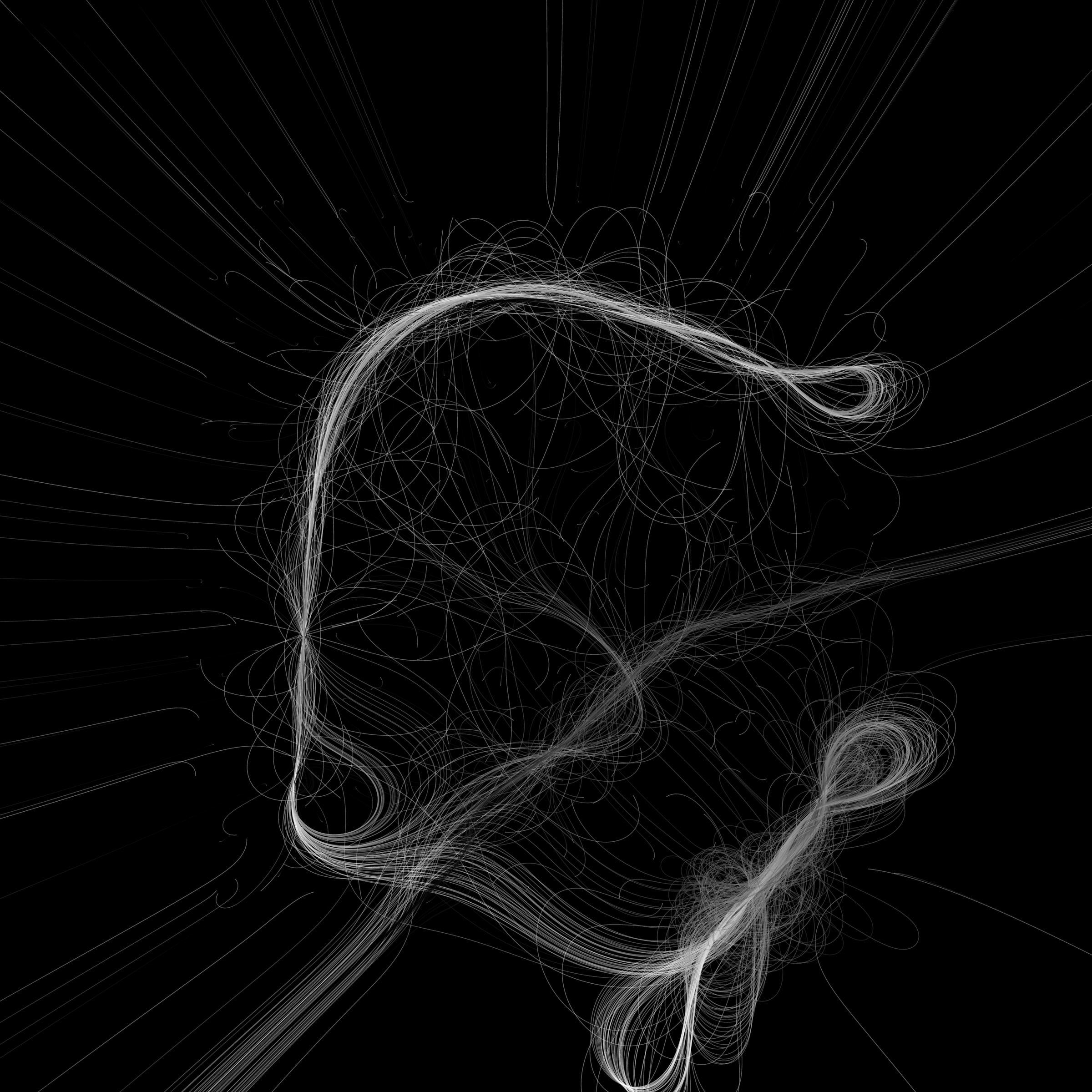 “Phototaxis” is a simulated environment populated by simple machines. After Valentino Braitenberg’s 1984 book “Vehicles,” there are four kinds of machines with different wiring and behaviors: Explorers, Aggressors, Lovers, and Cowards. Each line charts the history of one machine’s movement. The core of this code was the foundation for my MicroImage series of works dating back to 2001. I’ve worked on it in fits and starts since then, and in 2021 it was further developed for Art Blocks. Press ‘P’ to play/pause, ‘B’ for the big bang, ‘1’–’5’ to change the magnification, and ‘L’ to reveal the lights’ locations.