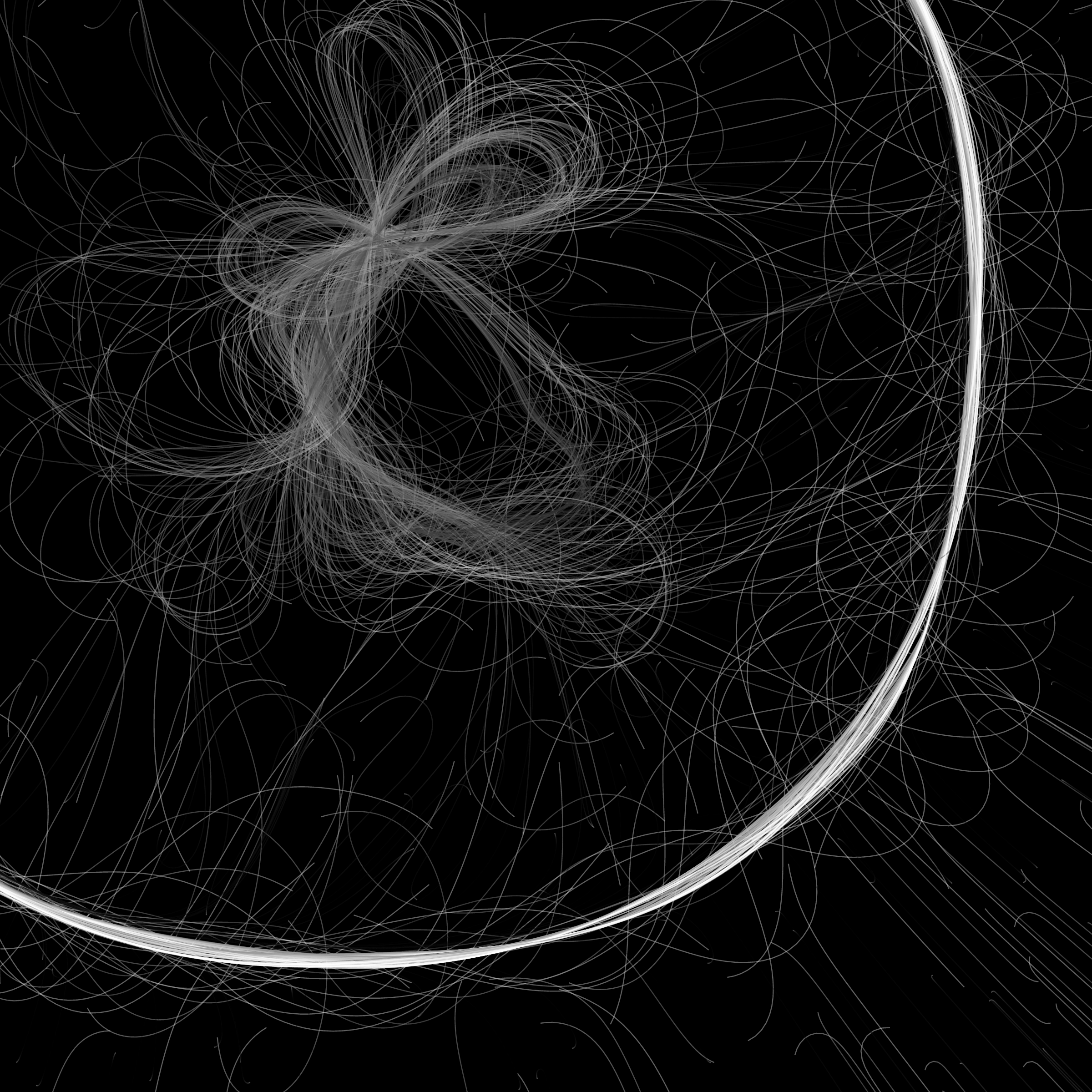 “Phototaxis” is a simulated environment populated by simple machines. After Valentino Braitenberg’s 1984 book “Vehicles,” there are four kinds of machines with different wiring and behaviors: Explorers, Aggressors, Lovers, and Cowards. Each line charts the history of one machine’s movement. The core of this code was the foundation for my MicroImage series of works dating back to 2001. I’ve worked on it in fits and starts since then, and in 2021 it was further developed for Art Blocks. Press ‘P’ to play/pause, ‘B’ for the big bang, ‘1’–’5’ to change the magnification, and ‘L’ to reveal the lights’ locations.
