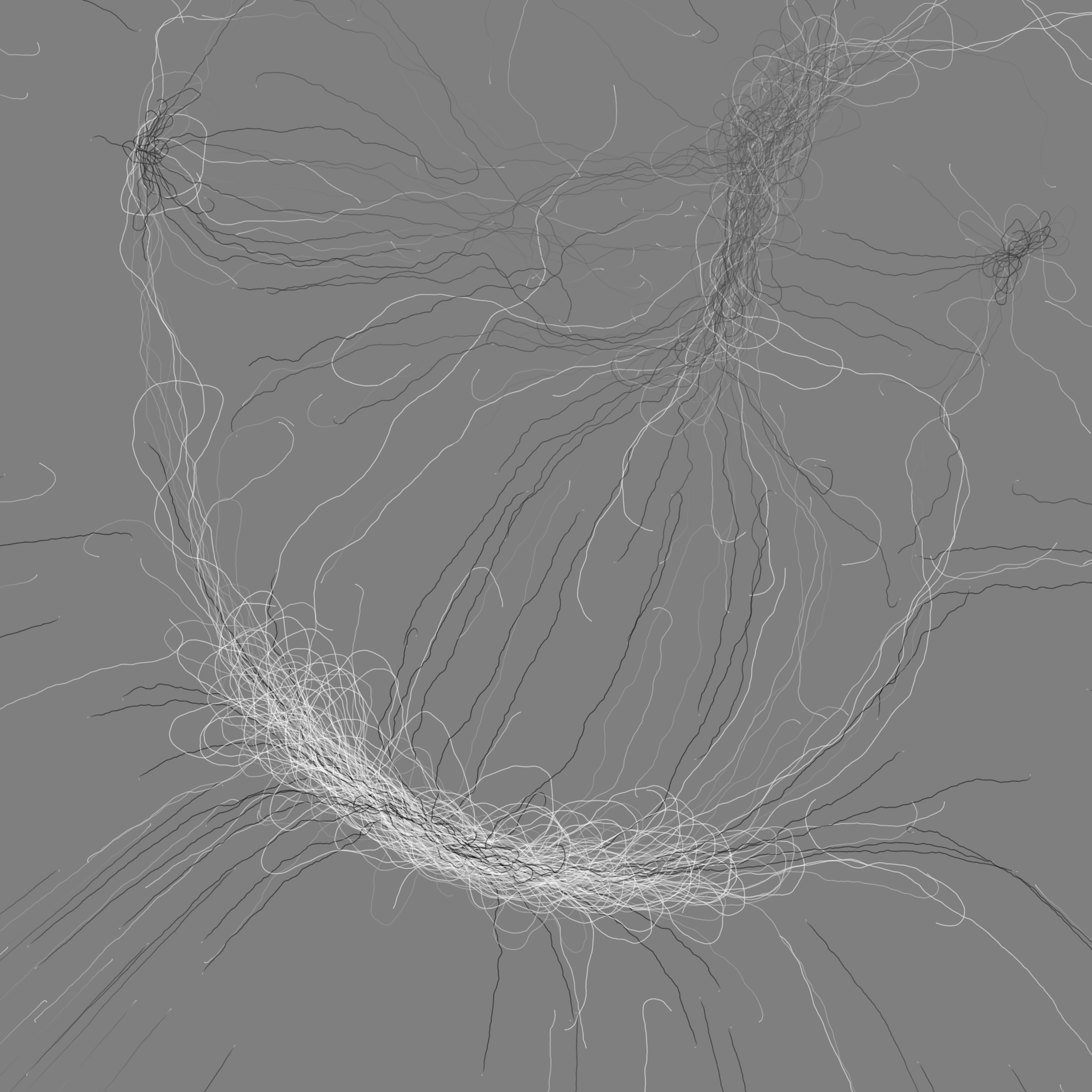 “Phototaxis” is a simulated environment populated by simple machines. After Valentino Braitenberg’s 1984 book “Vehicles,” there are four kinds of machines with different wiring and behaviors: Explorers, Aggressors, Lovers, and Cowards. Each line charts the history of one machine’s movement. The core of this code was the foundation for my MicroImage series of works dating back to 2001. I’ve worked on it in fits and starts since then, and in 2021 it was further developed for Art Blocks. Press ‘P’ to play/pause, ‘B’ for the big bang, ‘1’–’5’ to change the magnification, and ‘L’ to reveal the lights’ locations.