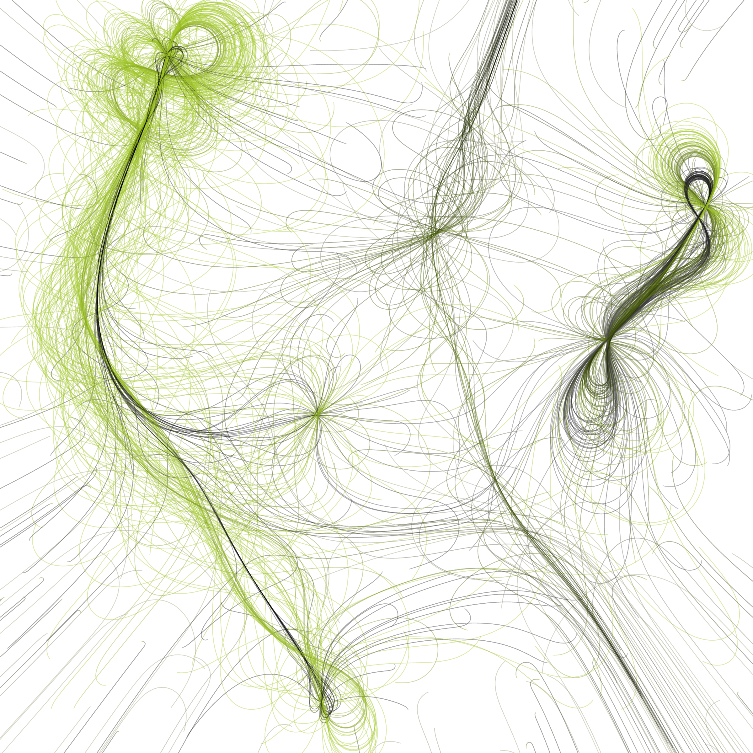 “Phototaxis” is a simulated environment populated by simple machines. After Valentino Braitenberg’s 1984 book “Vehicles,” there are four kinds of machines with different wiring and behaviors: Explorers, Aggressors, Lovers, and Cowards. Each line charts the history of one machine’s movement. The core of this code was the foundation for my MicroImage series of works dating back to 2001. I’ve worked on it in fits and starts since then, and in 2021 it was further developed for Art Blocks. Press ‘P’ to play/pause, ‘B’ for the big bang, ‘1’–’5’ to change the magnification, and ‘L’ to reveal the lights’ locations.