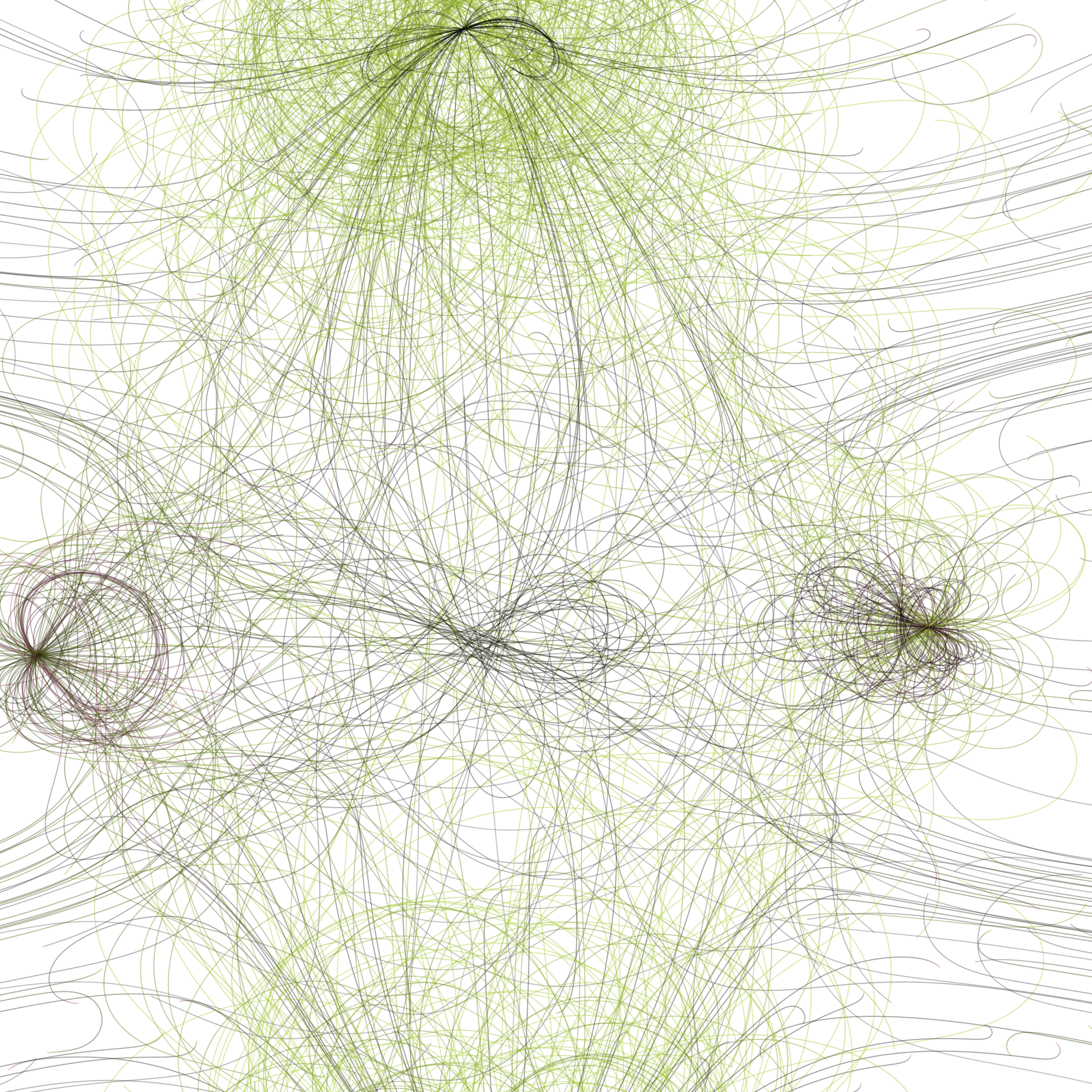 “Phototaxis” is a simulated environment populated by simple machines. After Valentino Braitenberg’s 1984 book “Vehicles,” there are four kinds of machines with different wiring and behaviors: Explorers, Aggressors, Lovers, and Cowards. Each line charts the history of one machine’s movement. The core of this code was the foundation for my MicroImage series of works dating back to 2001. I’ve worked on it in fits and starts since then, and in 2021 it was further developed for Art Blocks. Press ‘P’ to play/pause, ‘B’ for the big bang, ‘1’–’5’ to change the magnification, and ‘L’ to reveal the lights’ locations.