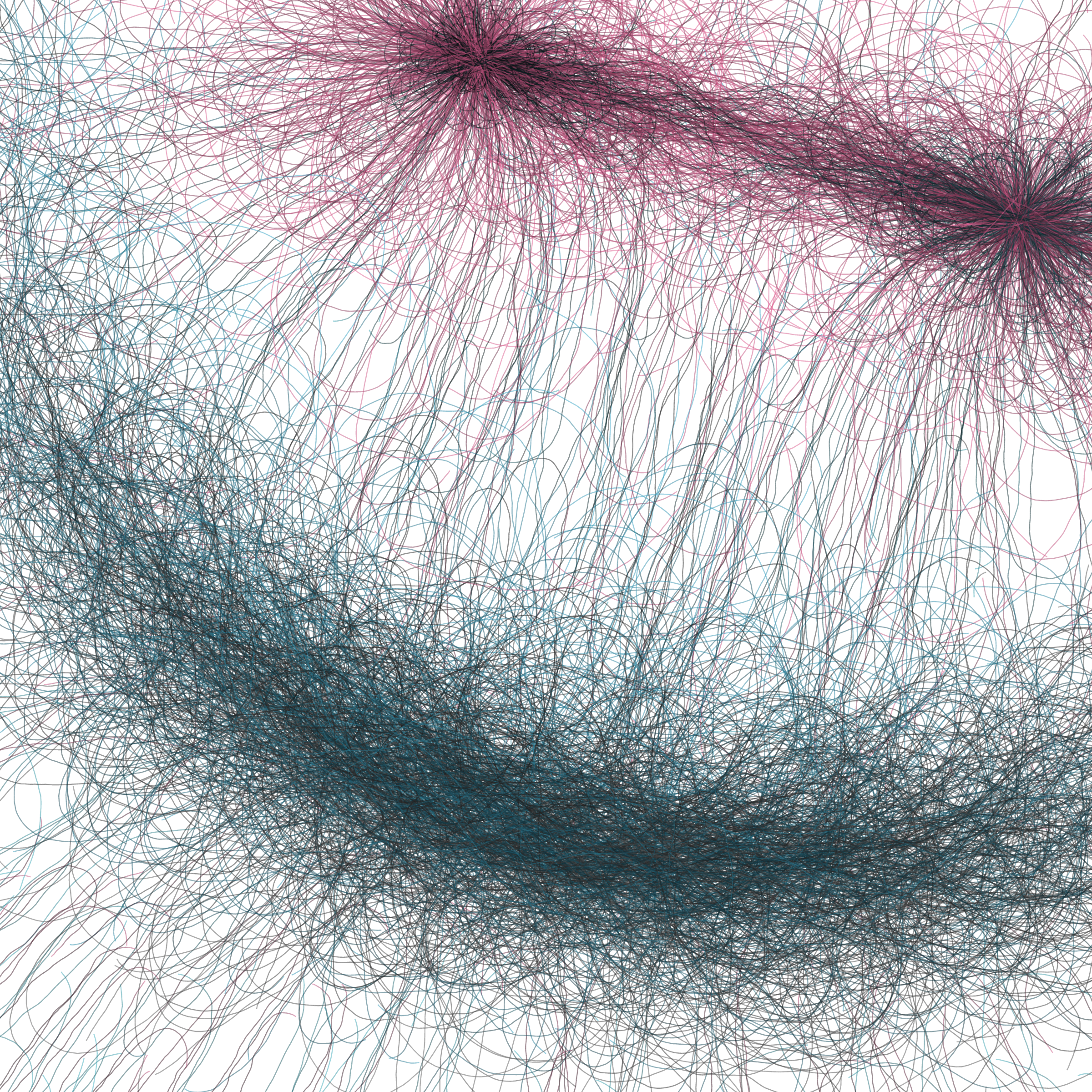 “Phototaxis” is a simulated environment populated by simple machines. After Valentino Braitenberg’s 1984 book “Vehicles,” there are four kinds of machines with different wiring and behaviors: Explorers, Aggressors, Lovers, and Cowards. Each line charts the history of one machine’s movement. The core of this code was the foundation for my MicroImage series of works dating back to 2001. I’ve worked on it in fits and starts since then, and in 2021 it was further developed for Art Blocks. Press ‘P’ to play/pause, ‘B’ for the big bang, ‘1’–’5’ to change the magnification, and ‘L’ to reveal the lights’ locations.