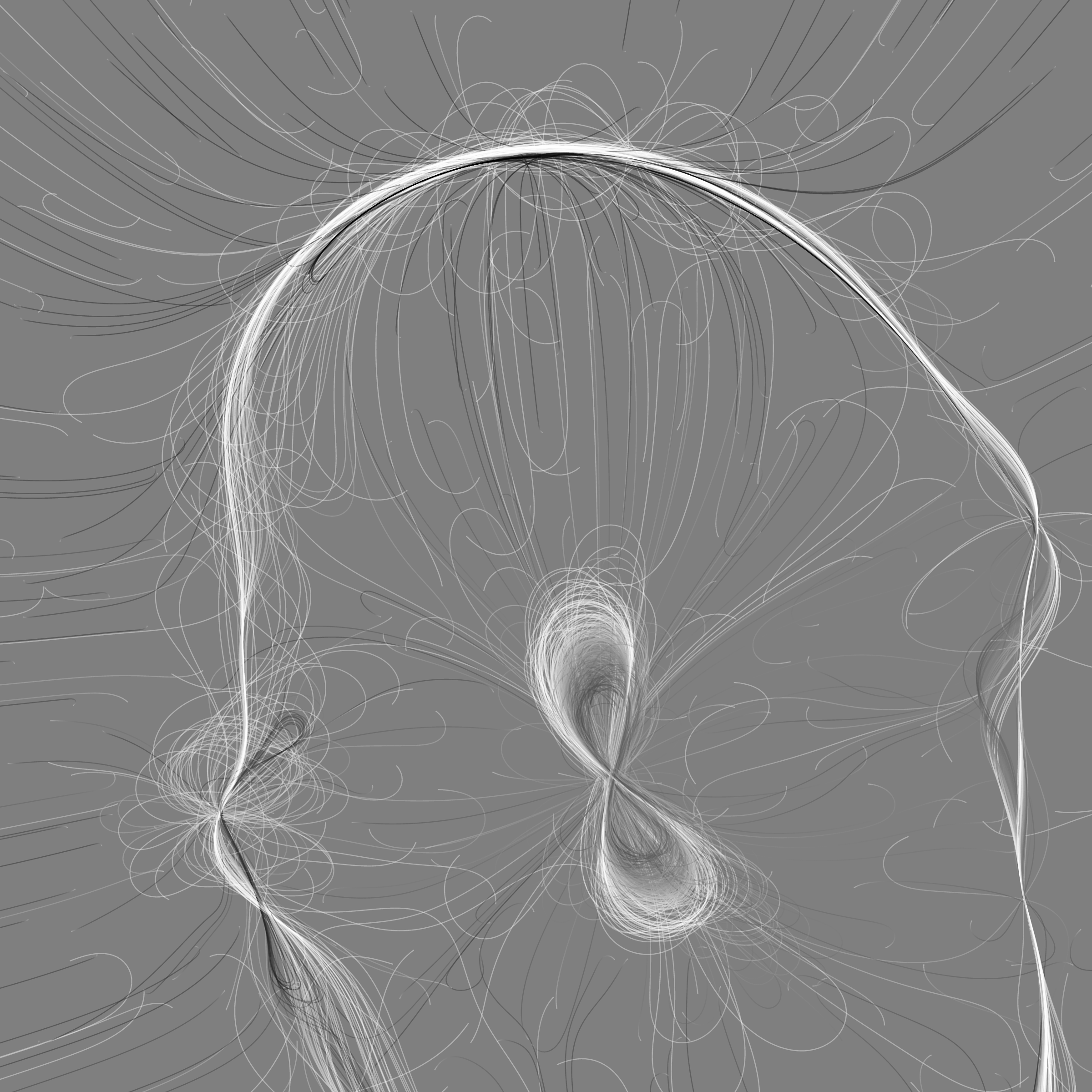 “Phototaxis” is a simulated environment populated by simple machines. After Valentino Braitenberg’s 1984 book “Vehicles,” there are four kinds of machines with different wiring and behaviors: Explorers, Aggressors, Lovers, and Cowards. Each line charts the history of one machine’s movement. The core of this code was the foundation for my MicroImage series of works dating back to 2001. I’ve worked on it in fits and starts since then, and in 2021 it was further developed for Art Blocks. Press ‘P’ to play/pause, ‘B’ for the big bang, ‘1’–’5’ to change the magnification, and ‘L’ to reveal the lights’ locations.