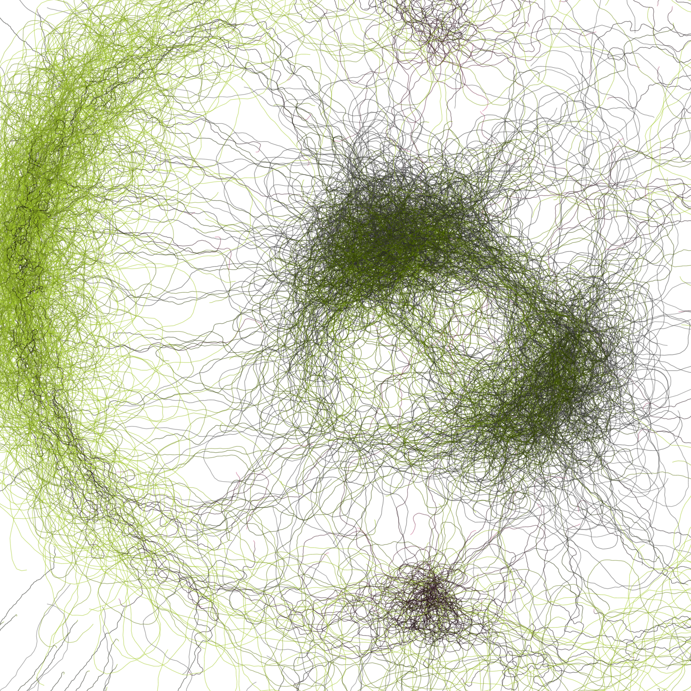 “Phototaxis” is a simulated environment populated by simple machines. After Valentino Braitenberg’s 1984 book “Vehicles,” there are four kinds of machines with different wiring and behaviors: Explorers, Aggressors, Lovers, and Cowards. Each line charts the history of one machine’s movement. The core of this code was the foundation for my MicroImage series of works dating back to 2001. I’ve worked on it in fits and starts since then, and in 2021 it was further developed for Art Blocks. Press ‘P’ to play/pause, ‘B’ for the big bang, ‘1’–’5’ to change the magnification, and ‘L’ to reveal the lights’ locations.