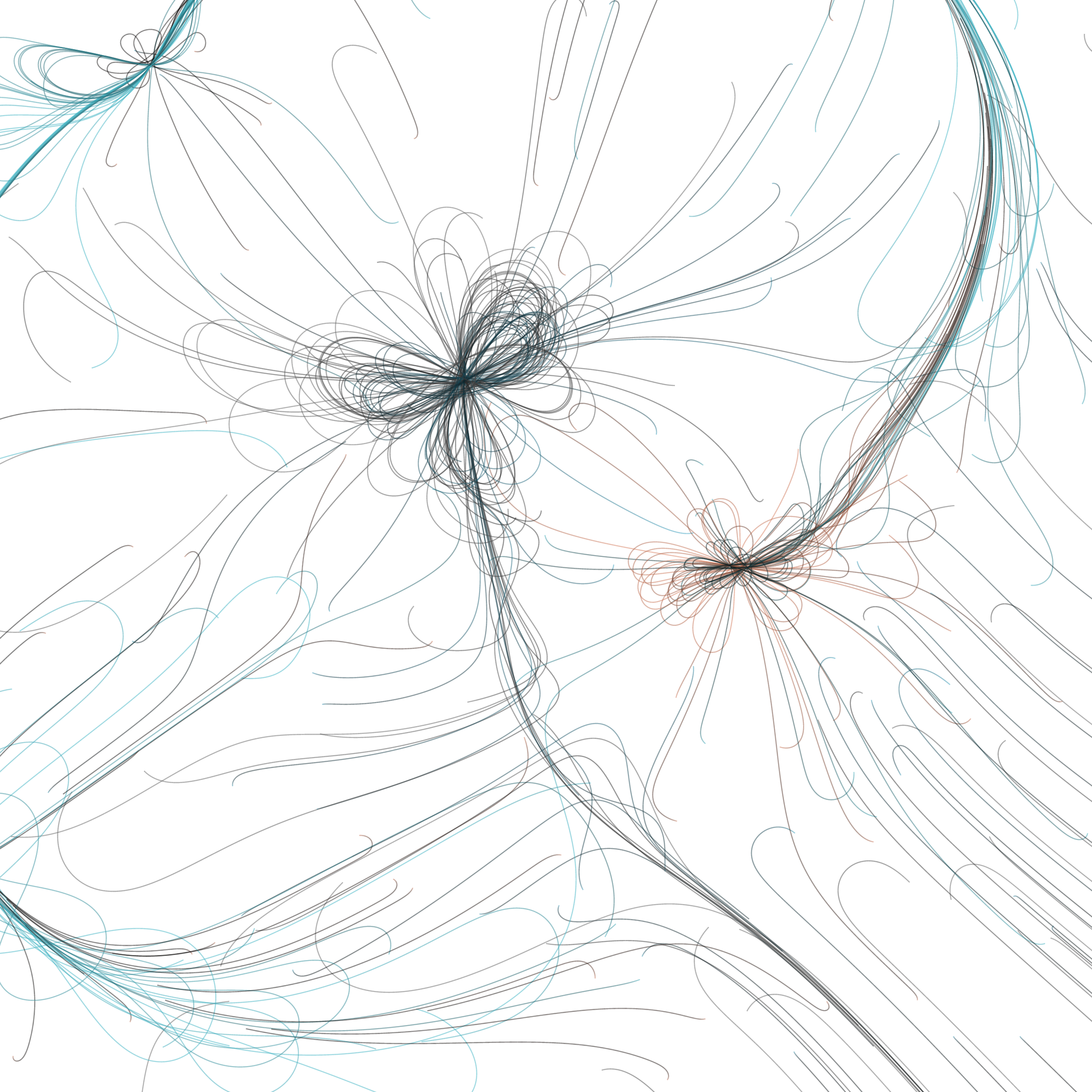 “Phototaxis” is a simulated environment populated by simple machines. After Valentino Braitenberg’s 1984 book “Vehicles,” there are four kinds of machines with different wiring and behaviors: Explorers, Aggressors, Lovers, and Cowards. Each line charts the history of one machine’s movement. The core of this code was the foundation for my MicroImage series of works dating back to 2001. I’ve worked on it in fits and starts since then, and in 2021 it was further developed for Art Blocks. Press ‘P’ to play/pause, ‘B’ for the big bang, ‘1’–’5’ to change the magnification, and ‘L’ to reveal the lights’ locations.