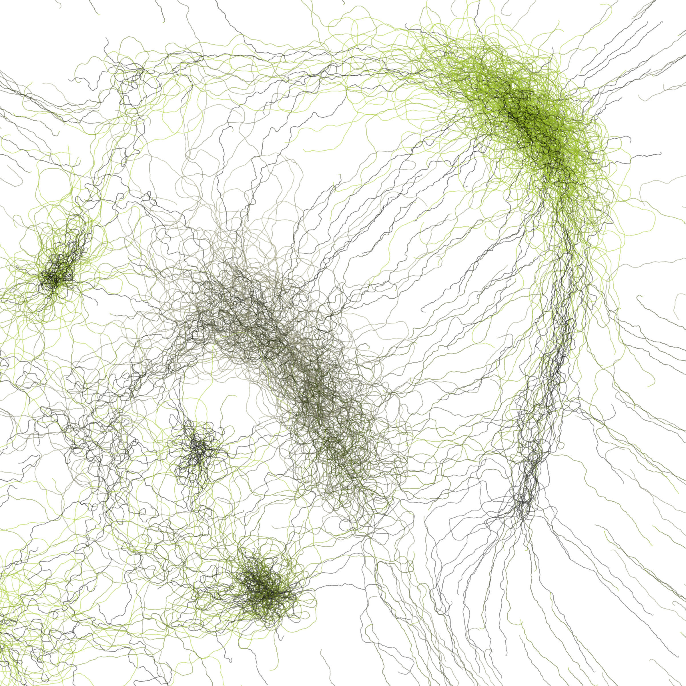 “Phototaxis” is a simulated environment populated by simple machines. After Valentino Braitenberg’s 1984 book “Vehicles,” there are four kinds of machines with different wiring and behaviors: Explorers, Aggressors, Lovers, and Cowards. Each line charts the history of one machine’s movement. The core of this code was the foundation for my MicroImage series of works dating back to 2001. I’ve worked on it in fits and starts since then, and in 2021 it was further developed for Art Blocks. Press ‘P’ to play/pause, ‘B’ for the big bang, ‘1’–’5’ to change the magnification, and ‘L’ to reveal the lights’ locations.
