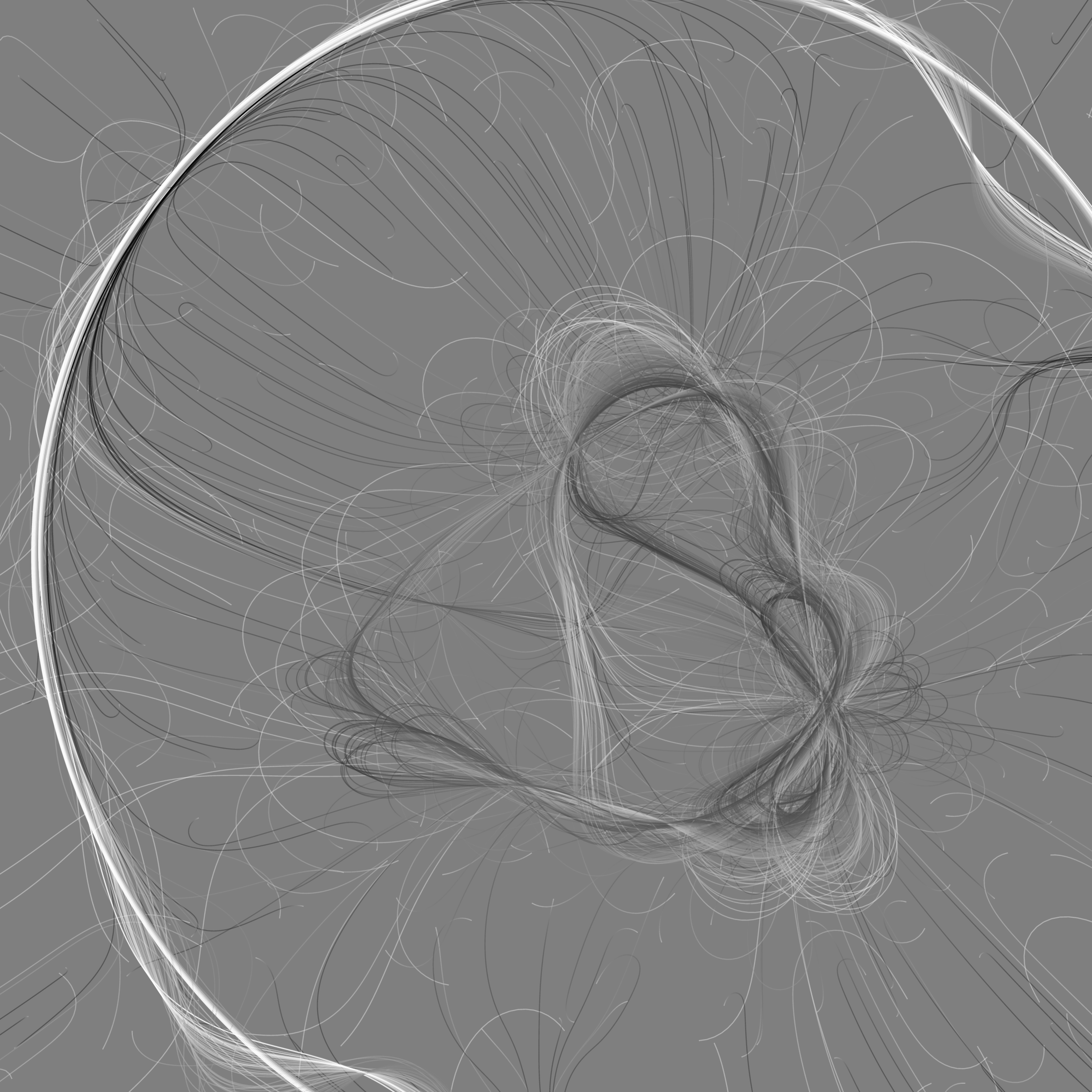 “Phototaxis” is a simulated environment populated by simple machines. After Valentino Braitenberg’s 1984 book “Vehicles,” there are four kinds of machines with different wiring and behaviors: Explorers, Aggressors, Lovers, and Cowards. Each line charts the history of one machine’s movement. The core of this code was the foundation for my MicroImage series of works dating back to 2001. I’ve worked on it in fits and starts since then, and in 2021 it was further developed for Art Blocks. Press ‘P’ to play/pause, ‘B’ for the big bang, ‘1’–’5’ to change the magnification, and ‘L’ to reveal the lights’ locations.