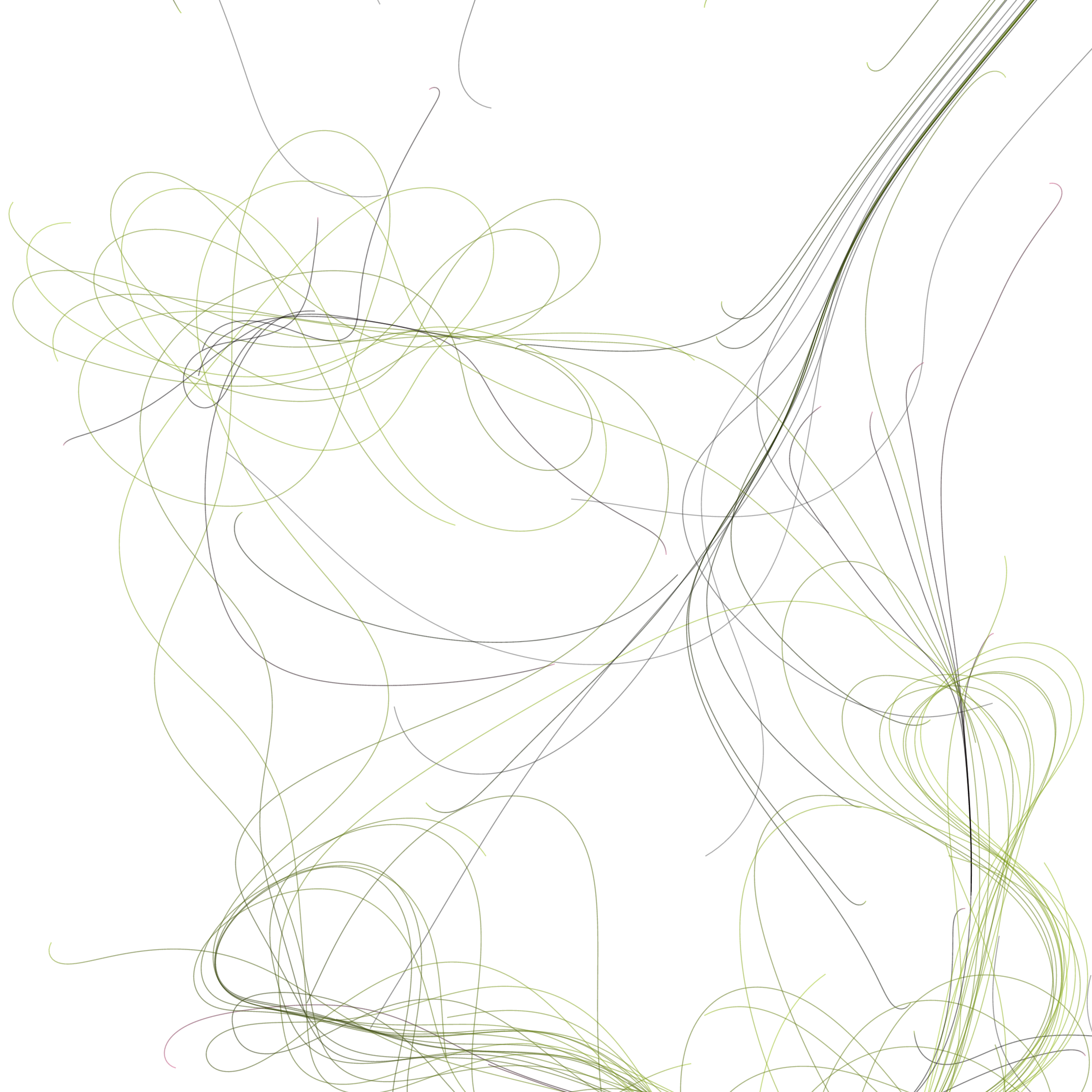 “Phototaxis” is a simulated environment populated by simple machines. After Valentino Braitenberg’s 1984 book “Vehicles,” there are four kinds of machines with different wiring and behaviors: Explorers, Aggressors, Lovers, and Cowards. Each line charts the history of one machine’s movement. The core of this code was the foundation for my MicroImage series of works dating back to 2001. I’ve worked on it in fits and starts since then, and in 2021 it was further developed for Art Blocks. Press ‘P’ to play/pause, ‘B’ for the big bang, ‘1’–’5’ to change the magnification, and ‘L’ to reveal the lights’ locations.