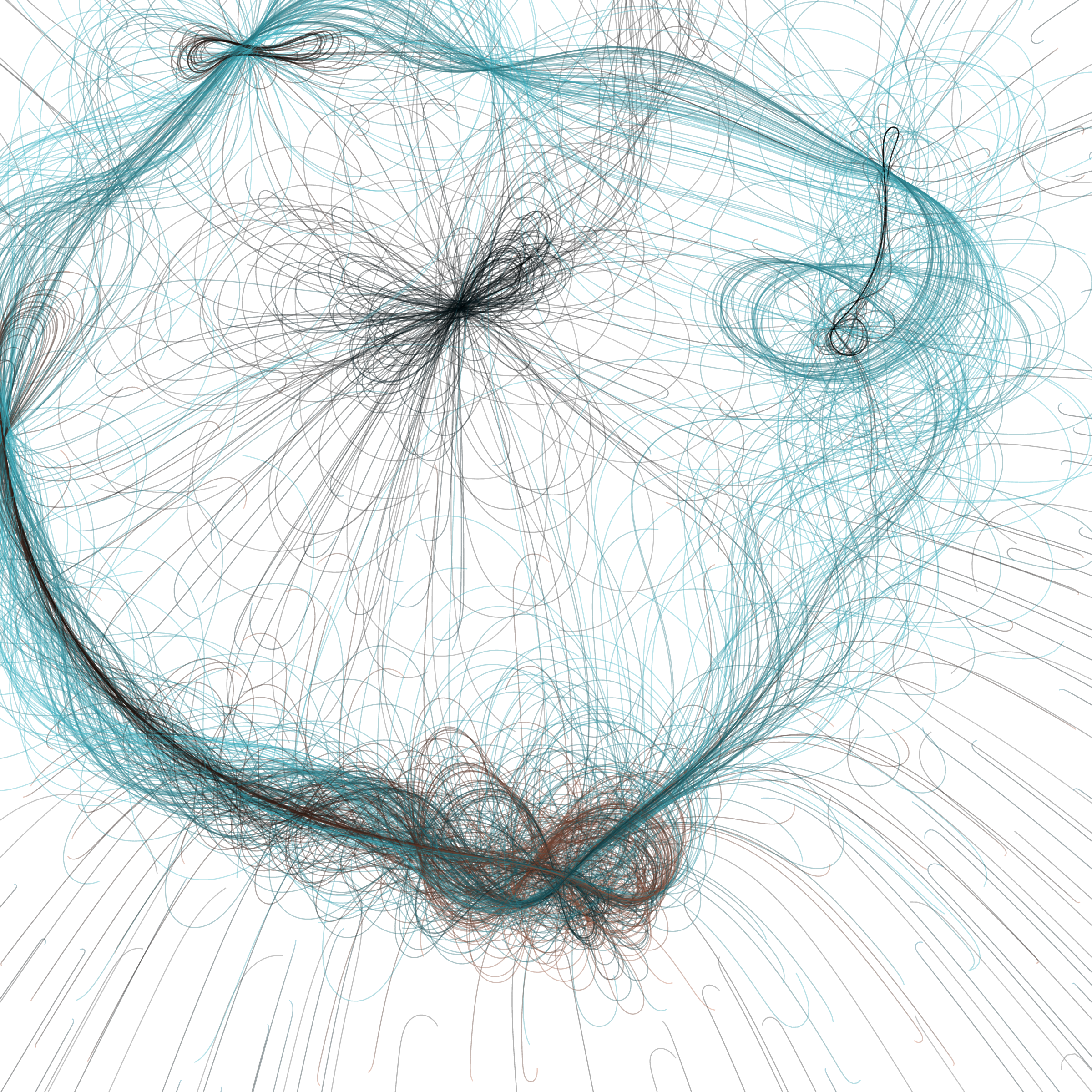 “Phototaxis” is a simulated environment populated by simple machines. After Valentino Braitenberg’s 1984 book “Vehicles,” there are four kinds of machines with different wiring and behaviors: Explorers, Aggressors, Lovers, and Cowards. Each line charts the history of one machine’s movement. The core of this code was the foundation for my MicroImage series of works dating back to 2001. I’ve worked on it in fits and starts since then, and in 2021 it was further developed for Art Blocks. Press ‘P’ to play/pause, ‘B’ for the big bang, ‘1’–’5’ to change the magnification, and ‘L’ to reveal the lights’ locations.