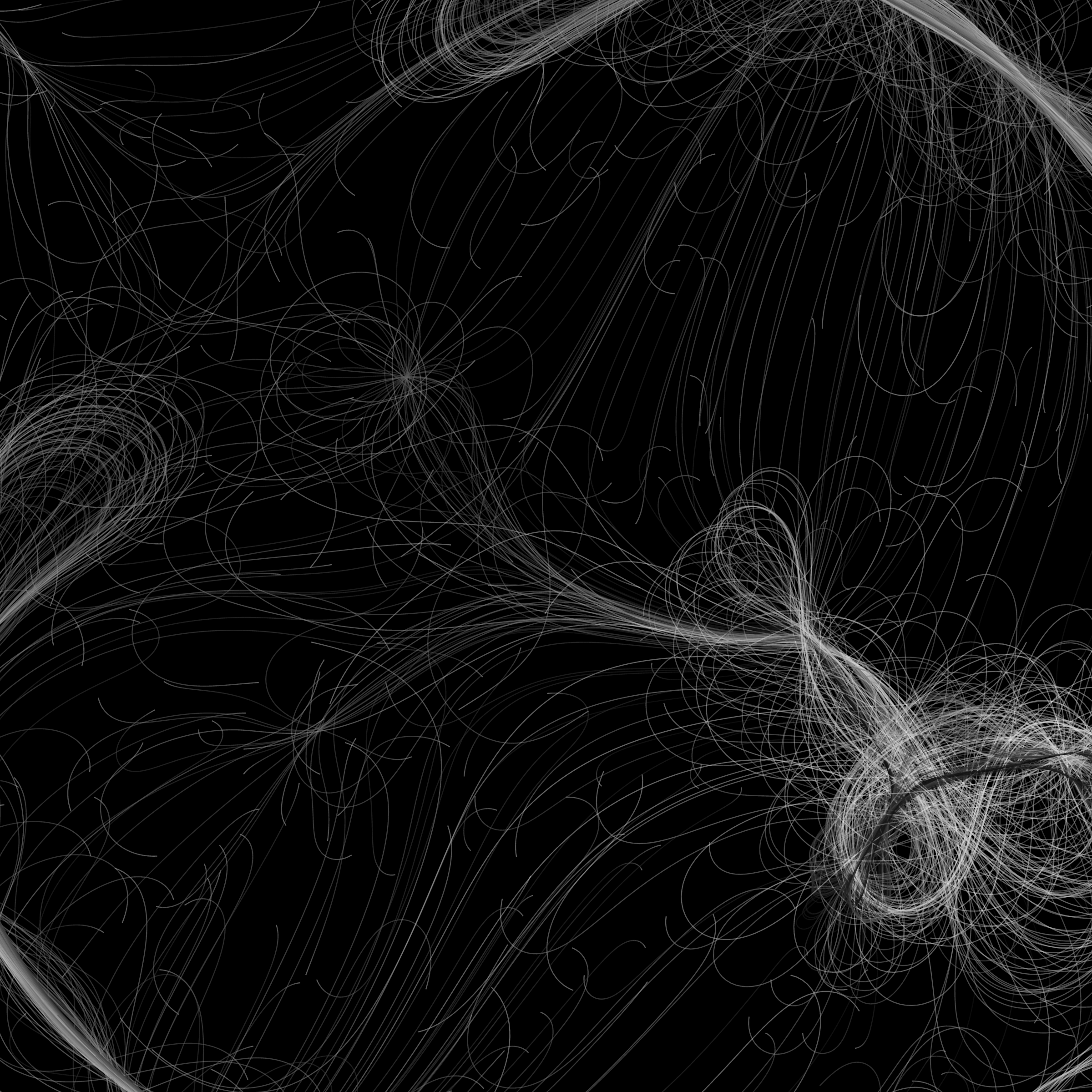 “Phototaxis” is a simulated environment populated by simple machines. After Valentino Braitenberg’s 1984 book “Vehicles,” there are four kinds of machines with different wiring and behaviors: Explorers, Aggressors, Lovers, and Cowards. Each line charts the history of one machine’s movement. The core of this code was the foundation for my MicroImage series of works dating back to 2001. I’ve worked on it in fits and starts since then, and in 2021 it was further developed for Art Blocks. Press ‘P’ to play/pause, ‘B’ for the big bang, ‘1’–’5’ to change the magnification, and ‘L’ to reveal the lights’ locations.