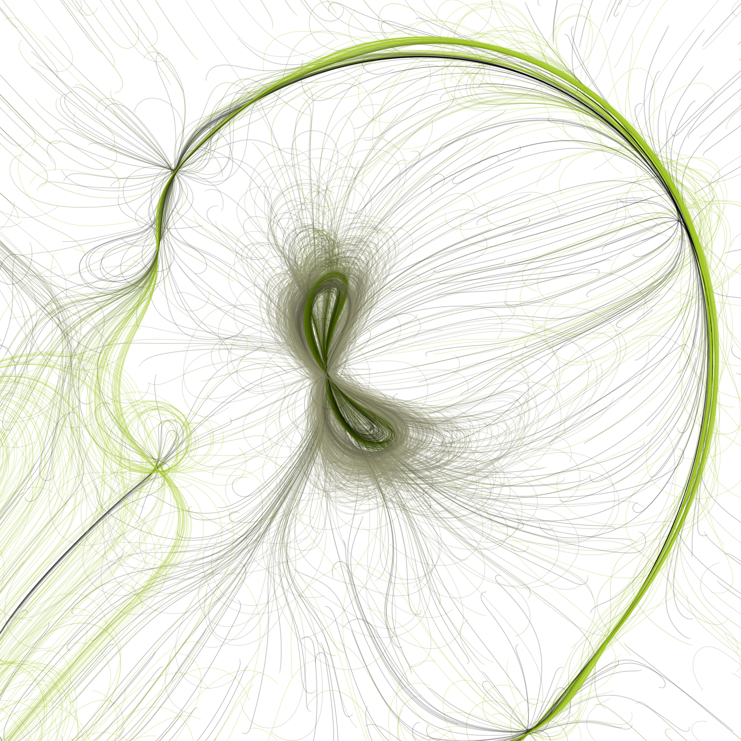 “Phototaxis” is a simulated environment populated by simple machines. After Valentino Braitenberg’s 1984 book “Vehicles,” there are four kinds of machines with different wiring and behaviors: Explorers, Aggressors, Lovers, and Cowards. Each line charts the history of one machine’s movement. The core of this code was the foundation for my MicroImage series of works dating back to 2001. I’ve worked on it in fits and starts since then, and in 2021 it was further developed for Art Blocks. Press ‘P’ to play/pause, ‘B’ for the big bang, ‘1’–’5’ to change the magnification, and ‘L’ to reveal the lights’ locations.