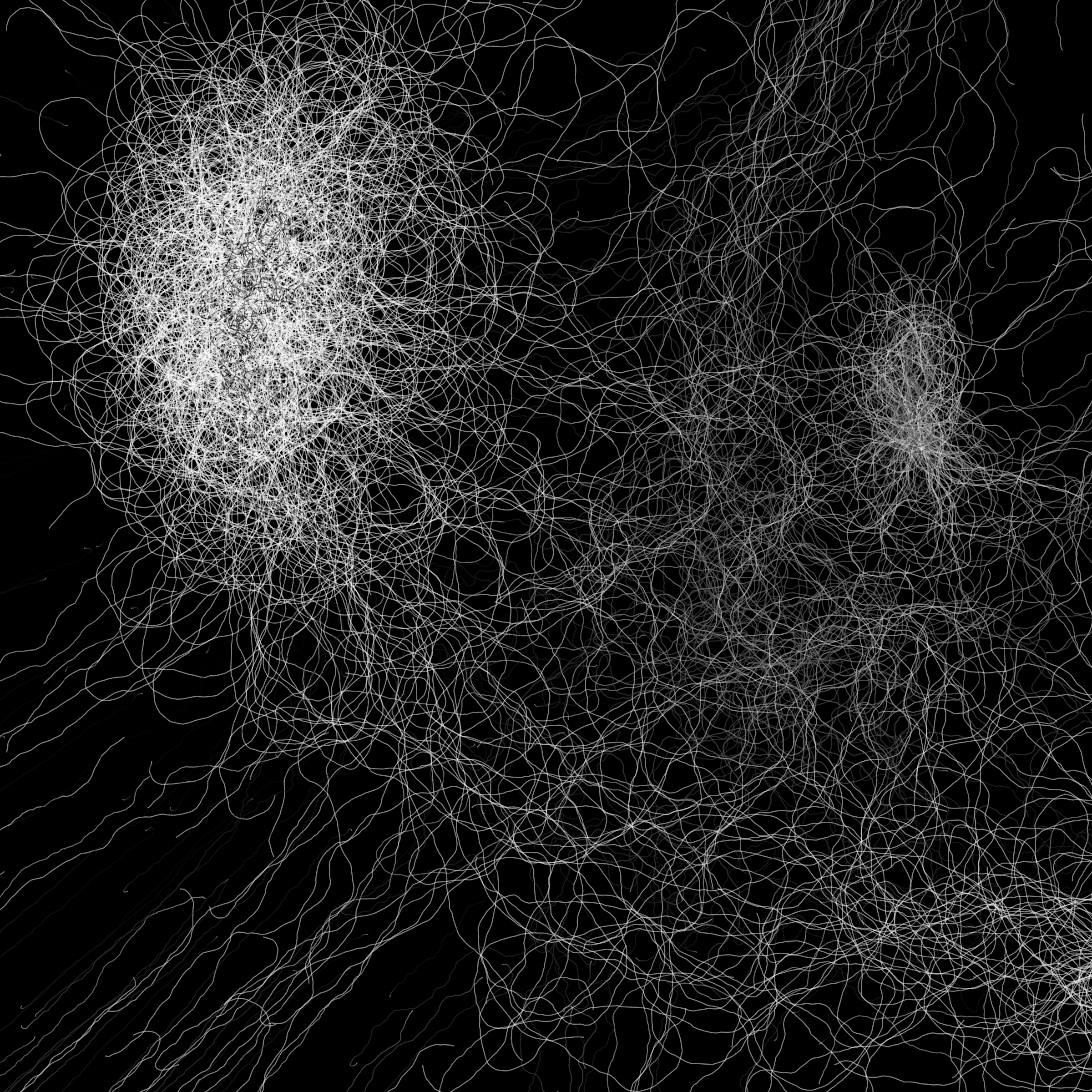 “Phototaxis” is a simulated environment populated by simple machines. After Valentino Braitenberg’s 1984 book “Vehicles,” there are four kinds of machines with different wiring and behaviors: Explorers, Aggressors, Lovers, and Cowards. Each line charts the history of one machine’s movement. The core of this code was the foundation for my MicroImage series of works dating back to 2001. I’ve worked on it in fits and starts since then, and in 2021 it was further developed for Art Blocks. Press ‘P’ to play/pause, ‘B’ for the big bang, ‘1’–’5’ to change the magnification, and ‘L’ to reveal the lights’ locations.