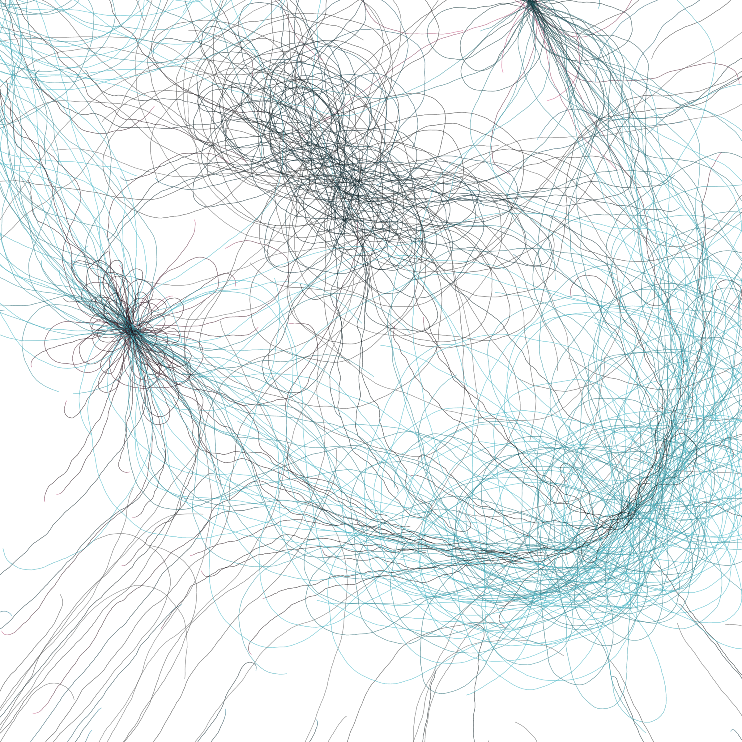 “Phototaxis” is a simulated environment populated by simple machines. After Valentino Braitenberg’s 1984 book “Vehicles,” there are four kinds of machines with different wiring and behaviors: Explorers, Aggressors, Lovers, and Cowards. Each line charts the history of one machine’s movement. The core of this code was the foundation for my MicroImage series of works dating back to 2001. I’ve worked on it in fits and starts since then, and in 2021 it was further developed for Art Blocks. Press ‘P’ to play/pause, ‘B’ for the big bang, ‘1’–’5’ to change the magnification, and ‘L’ to reveal the lights’ locations.